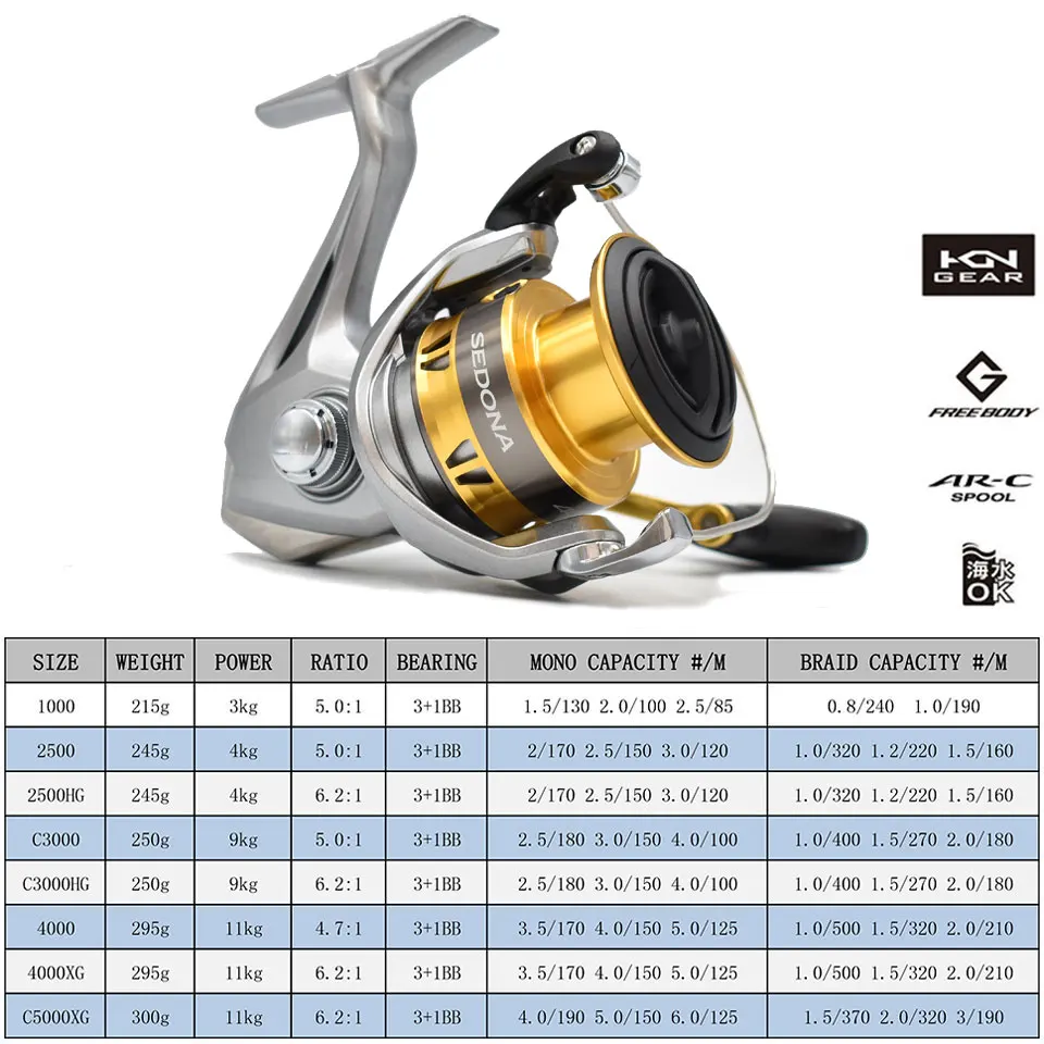 Катушка для спиннинга SHIMANO SEDONA, передаточное число 3 + 1BB, передача HAGANE GEAR 3-11 кг, мощность 1000-C5000XG