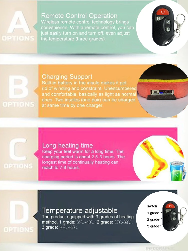 Ответ: дистанционное управлениеТехнология беспроводного дистанционного управления приноситУдобство. С пультом дистанционного управления, выМожно просто включить и выключить, дажеРегулировка температуры (три сорта)В.: поддержка зарядкиВстроенный аккумулятор в стельке позволяет получитьИзбавьтесь от намотки и ограничений. НеиспользованныйИ удобный, в основном как светильник, как нормальный.Две стельки (одна пара) можно заряжать одновременно одним зарядным устройствомC: долгое время нагреваУдерживайте ноги в тепле в течение длительного времени.Периода зарядки составляет около 2,5-3 часа. ВДолгое время lf непрерывное нагревание может достигать 7-8 часов.D представления: регулировка температурыПродукт оснащен 3 классами нагреваВыше результат испытаний на нагрев основан на температуре окружающей среды 10 градусов Цельсия. Нагревательные элементы из углеродного волокна обычно нагреваются + 25 градусов по Цельсию выше температуры окружающей среды на высоком уровне. Е. Г.: если температура вашей комнаты 20 градусов Цельсия, то тепло будет около 45 градусов Цельсия через 5-8 минут нагрева. Вы можете проверить температуру нагрева с помощью термометра, так как иногда нашему организму трудно почувствовать тепло, когда он находится рядом с температурой тела. Кстати, надев стельки с подогревом, они лучше сохранят тепло.5. Наши услуги и почему выбирают нас?ISO 9001:2008-сертифицированная фабрика с передовым производственным оборудованием и испытательным оборудованиемПрофессиональную команду научных исследований и разработки с более чем для детей 10 лет опыта в стельки с обогревомРазумная заводская цена на основе разного количества нагревательных стелек на разных рынкахCE, GS, BS, SAA, UL, CUL, EMC, LVD, FCC сертифицированное зарядное устройство для нагревательных стелекОпытный в продажах и маркетинге, в течение 12 часов быстрый ответ, честный и надежный6. Наши Сертификаты: