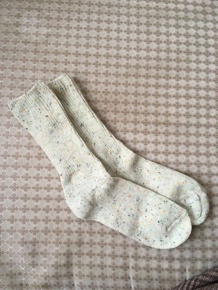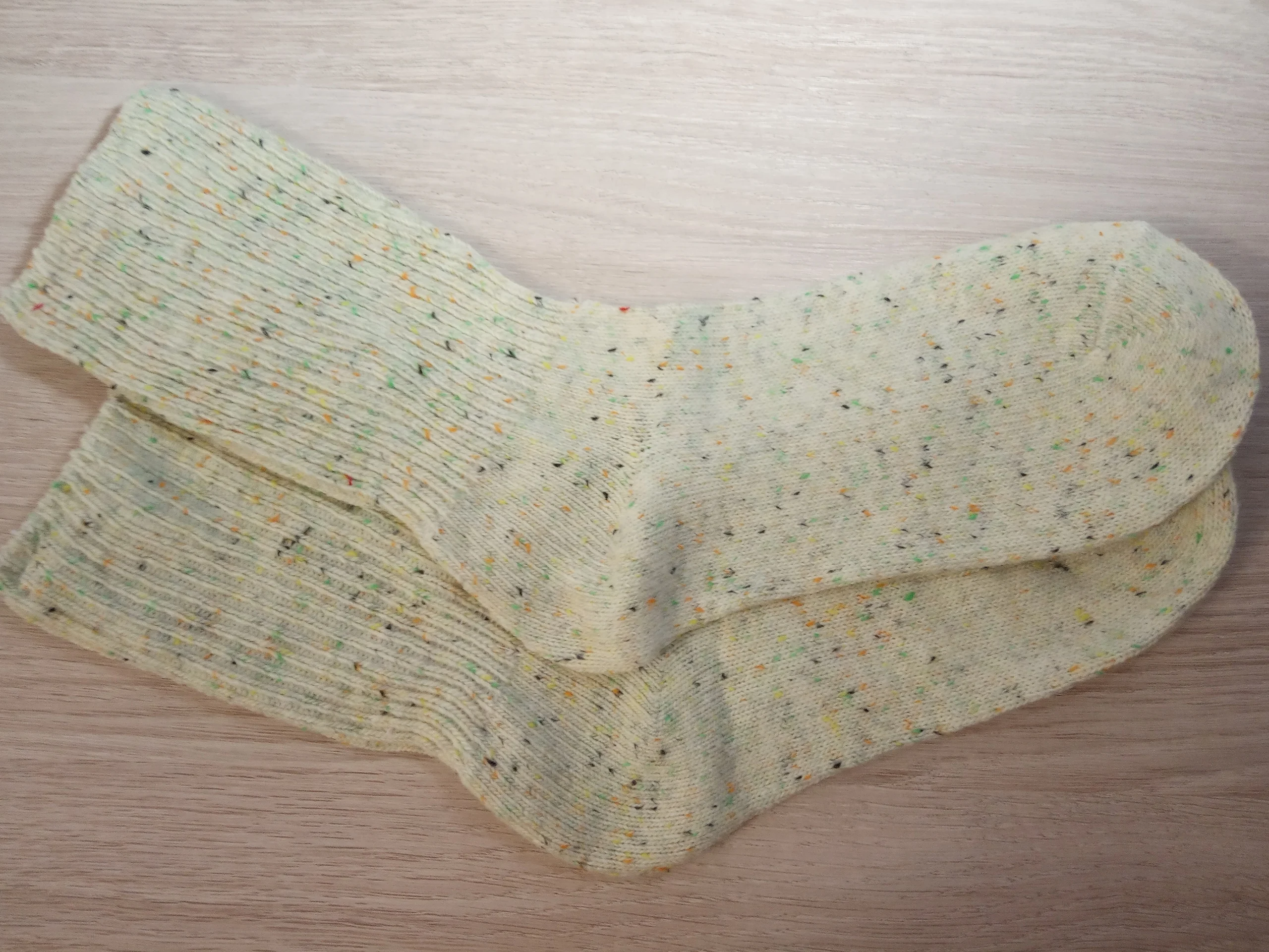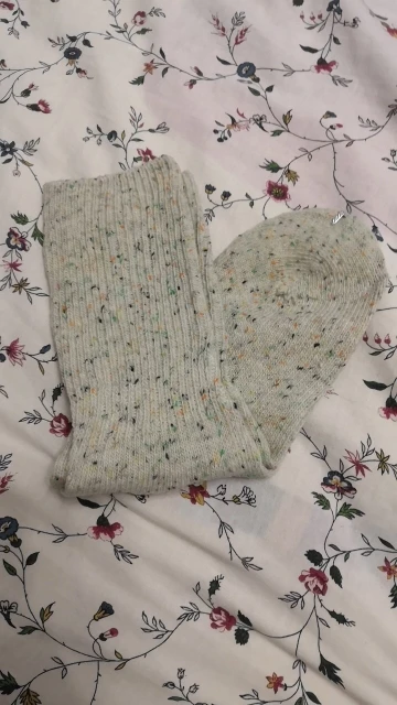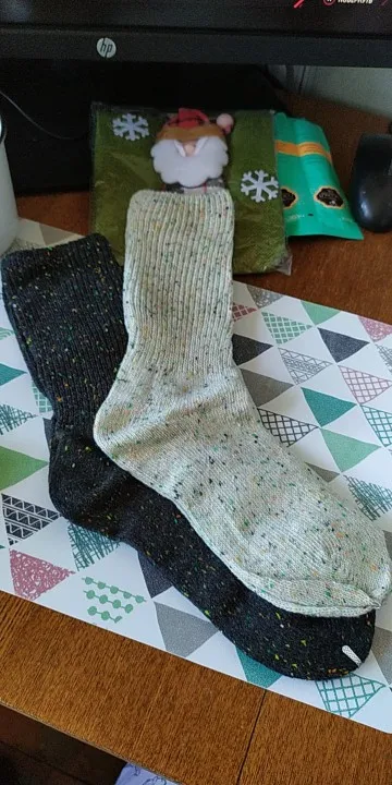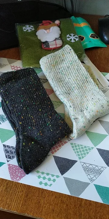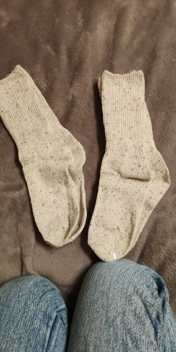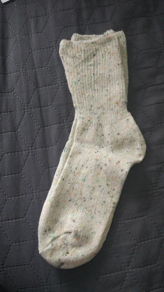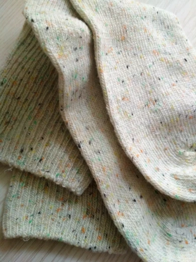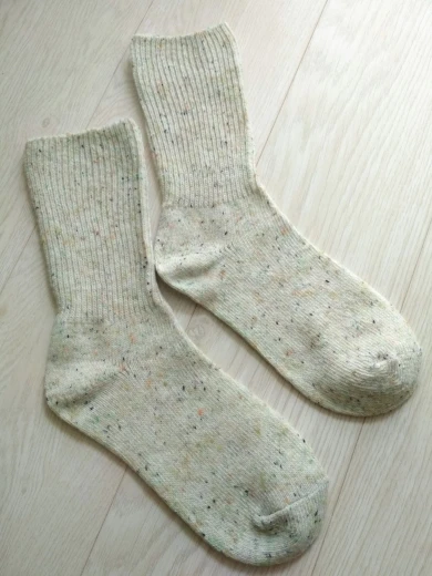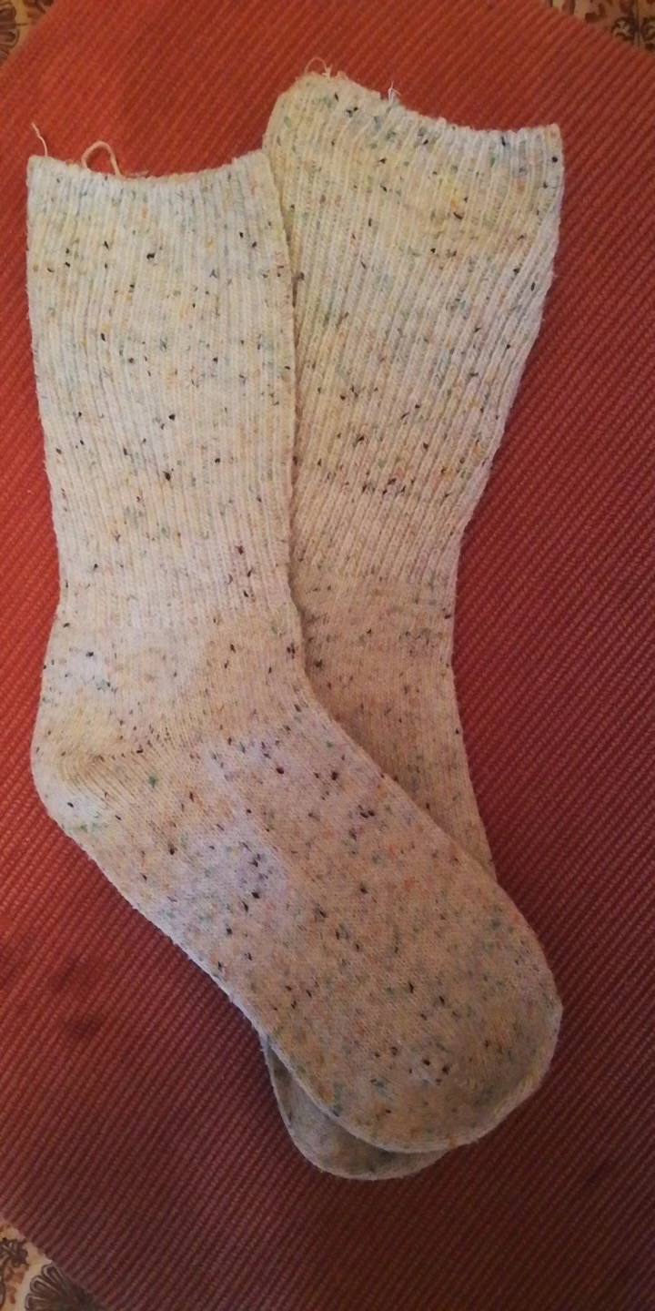 Носки классные, не толстые, вязка тонкая, тепленькие и приятные, сверху нет резинки, поэтому не впиваются в ногу. На размер 36,5 отлично сели. Натуральный состав. Они не однотонные, а меланж, с яркими вкраплениями. Пришли буквально за 2 недели на крайний север. В общем, классный продукт, но мне попался брак - один носок сверху был испачкан машинными маслом((( Вонь была жуткая! Попробовала отстирать - не получилось (последнее фото после стирки), открыли спор - без проблем вернули деньги. Продавец порядочный, продукт качественный - рекомендую!