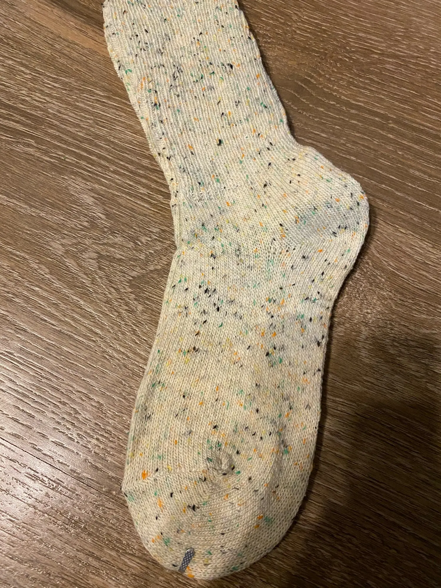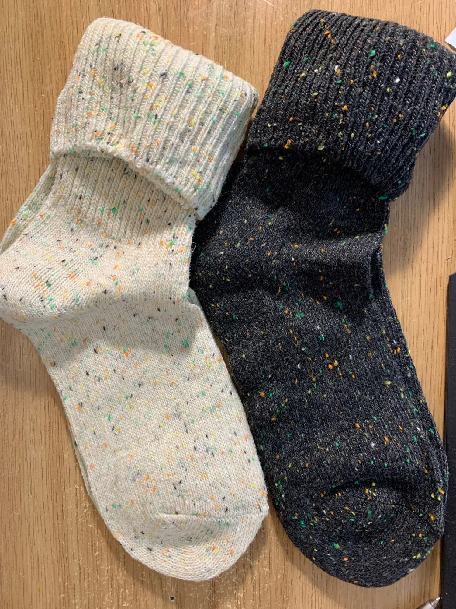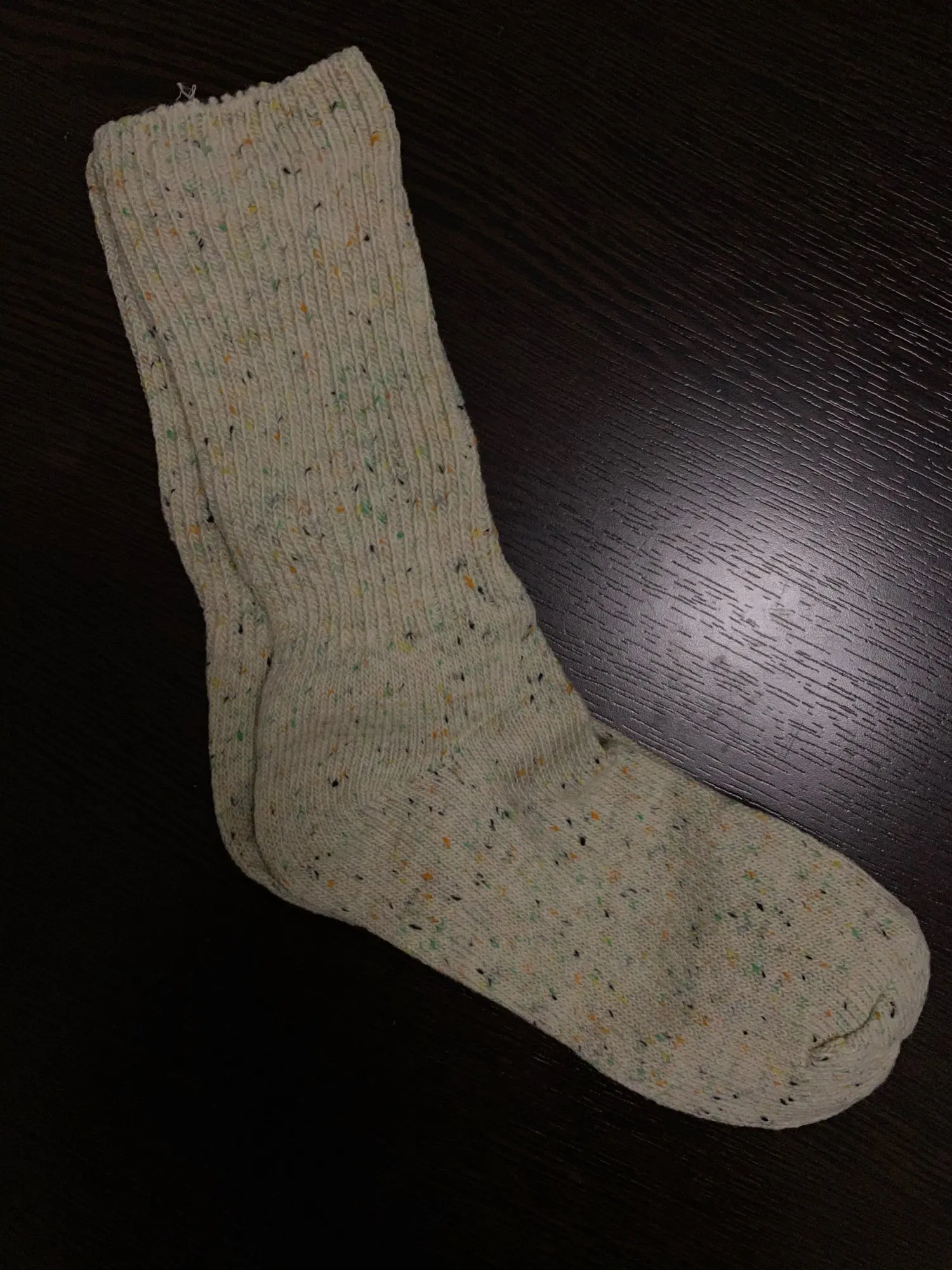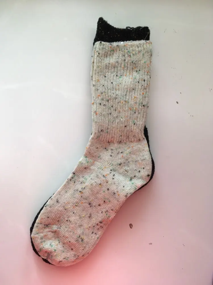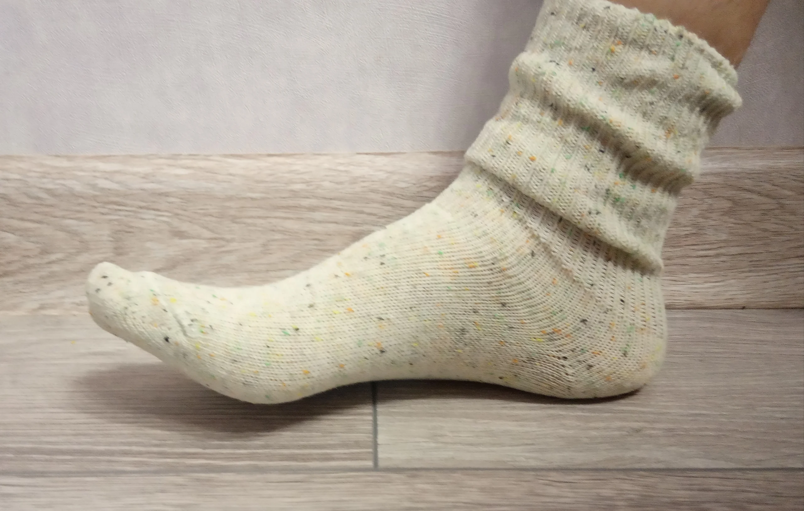 Носки классные, не толстые, вязка тонкая, тепленькие и приятные, сверху нет резинки, поэтому не впиваются в ногу. На размер 36,5 отлично сели. Натуральный состав. Они не однотонные, а меланж, с яркими вкраплениями. Пришли буквально за 2 недели на крайний север. В общем, классный продукт, но мне попался брак - один носок сверху был испачкан машинными маслом((( Вонь была жуткая! Попробовала отстирать - не получилось (последнее фото после стирки), открыли спор - без проблем вернули деньги. Продавец порядочный, продукт качественный - рекомендую!