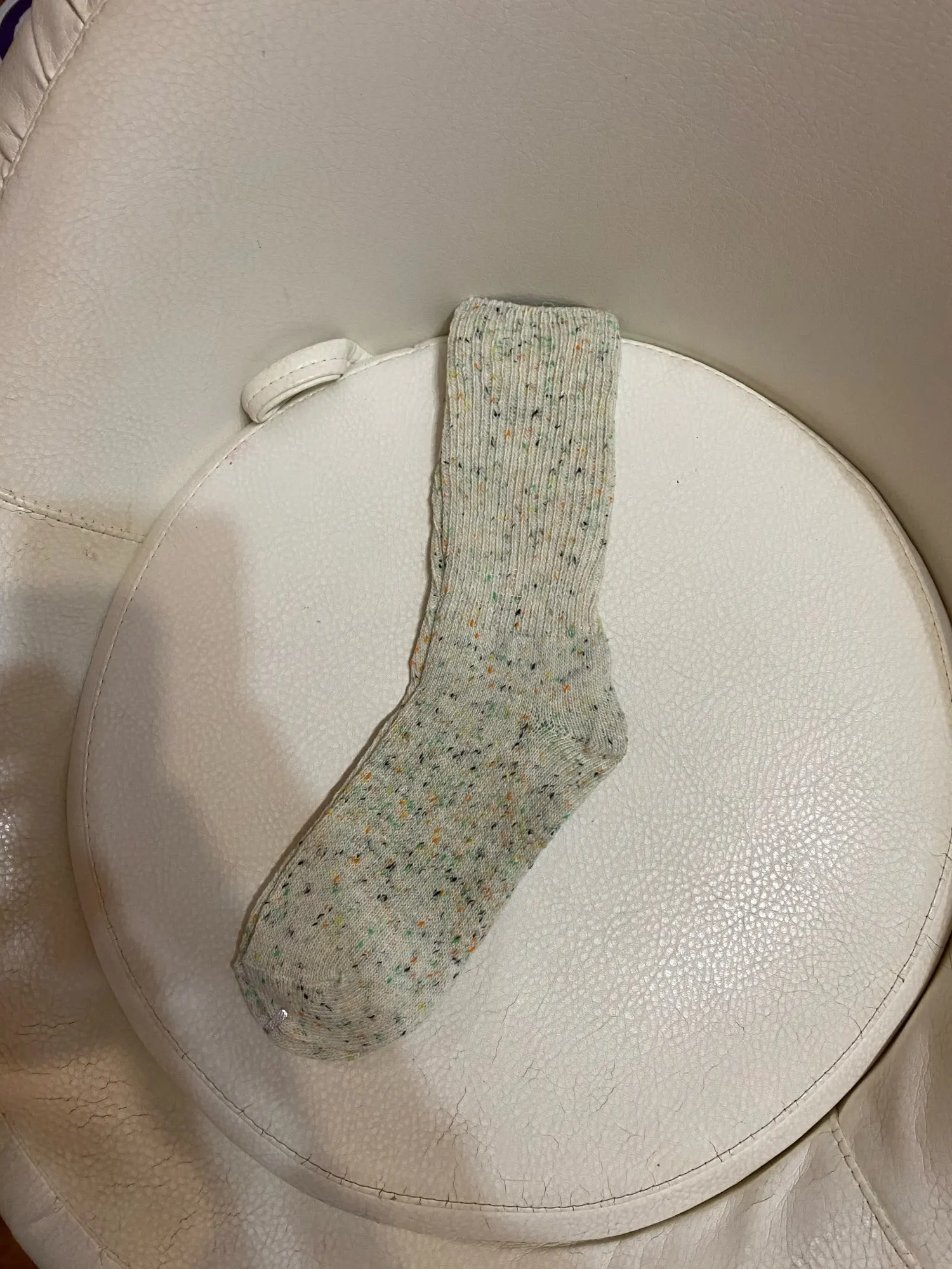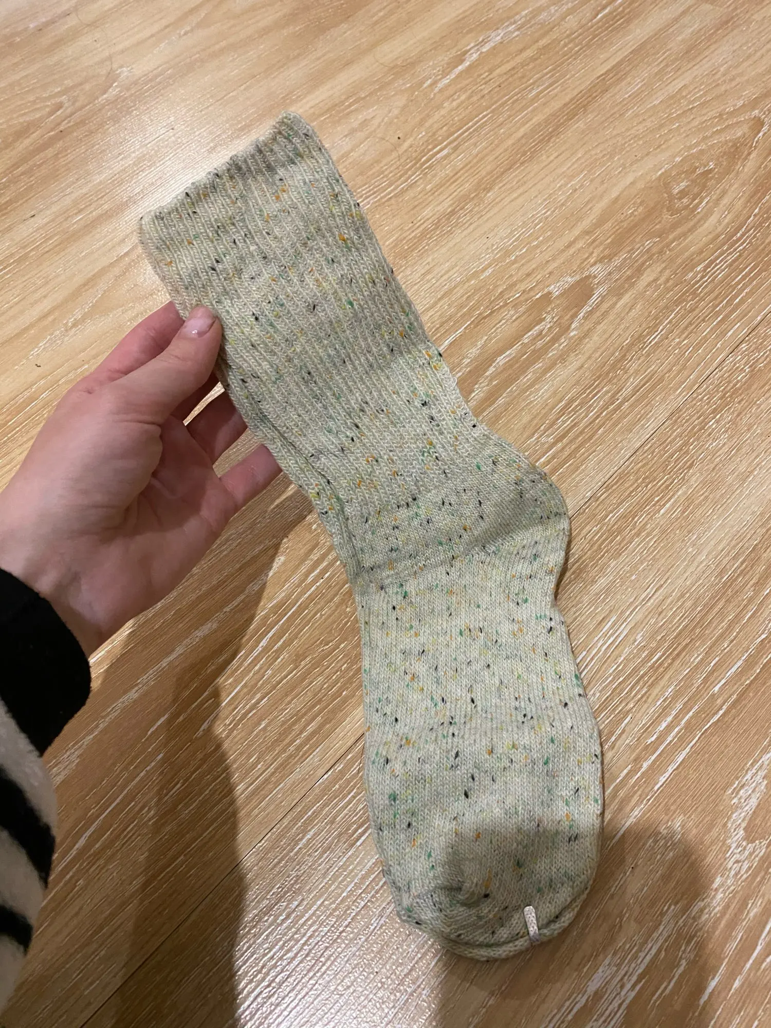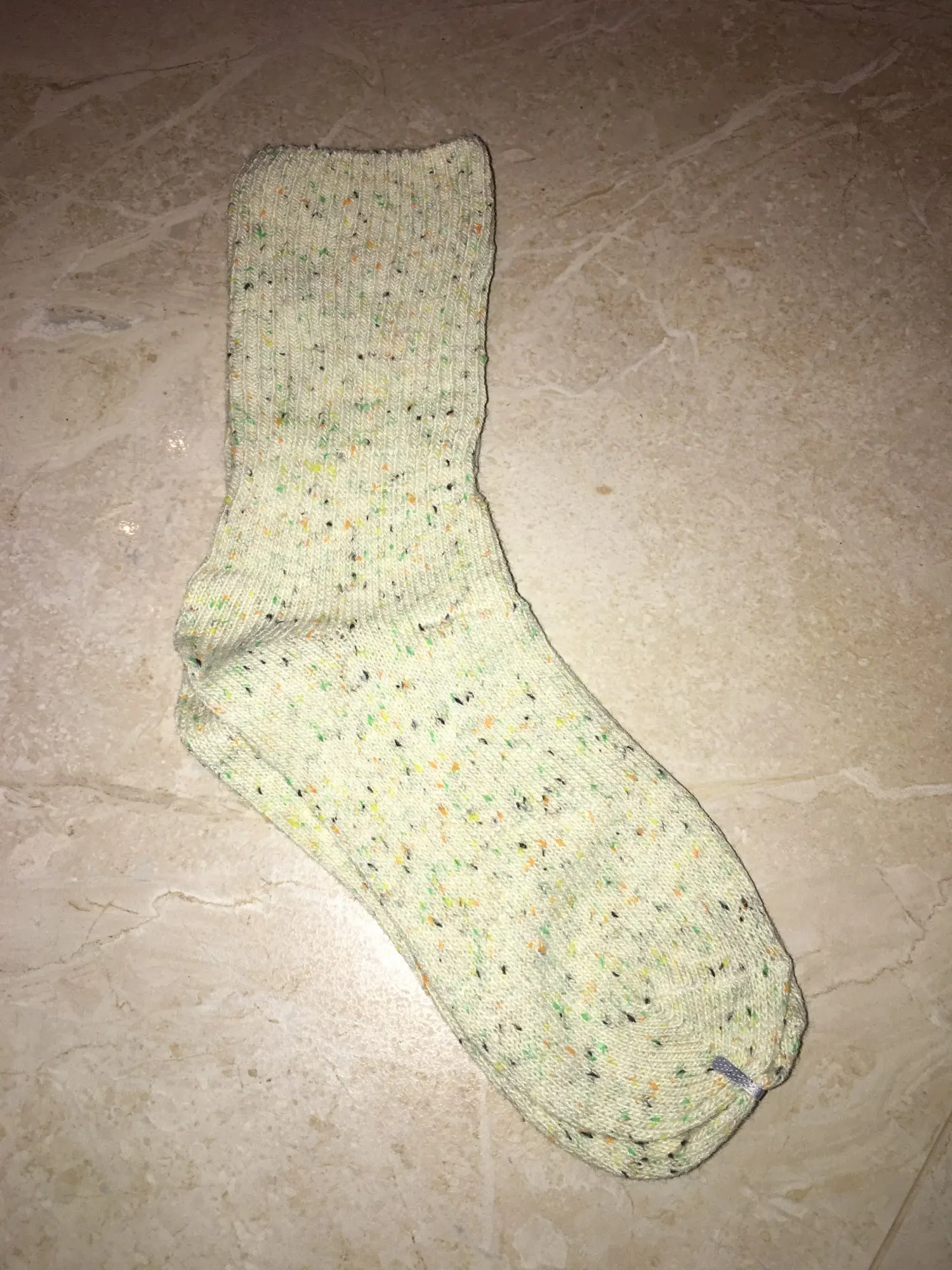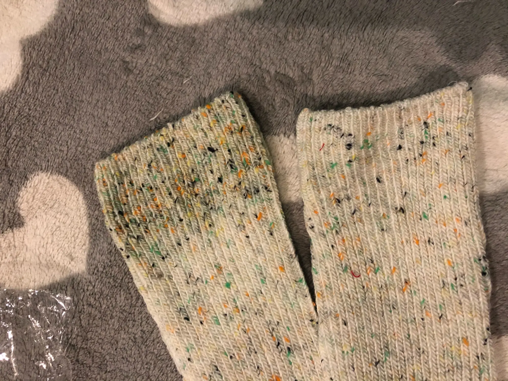 Носки классные, не толстые, вязка тонкая, тепленькие и приятные, сверху нет резинки, поэтому не впиваются в ногу. На размер 36,5 отлично сели. Натуральный состав. Они не однотонные, а меланж, с яркими вкраплениями. Пришли буквально за 2 недели на крайний север. В общем, классный продукт, но мне попался брак - один носок сверху был испачкан машинными маслом((( Вонь была жуткая! Попробовала отстирать - не получилось (последнее фото после стирки), открыли спор - без проблем вернули деньги. Продавец порядочный, продукт качественный - рекомендую!