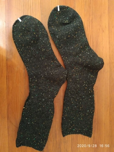Неплохие носки. По ощущениям, голимая синтетика, но довольно мягкая. Носки нетолстые, на большие холода не подойдут, но вполне справляются с -5. Единственное, что меня немного расстроило из-за цветных вкраплений кажется, что носки темно-зеленые, хотя они темно-темно серые. Но все равно выглядят прилично.