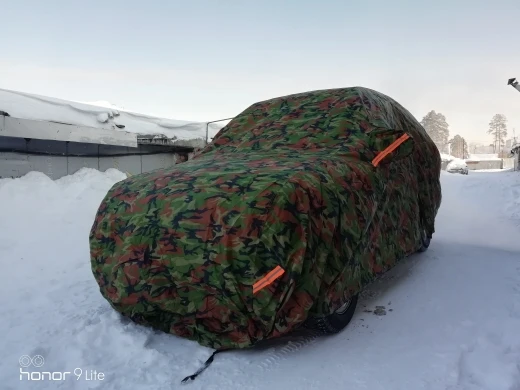 На рав 4 взяла размер YM, прекрасно подошёл. Качество отличное. С обратной стороны серебристый, есть молния, спереди и сзади по низу резинка,имеются ремешки для крепления, но их недостаточно, пришлось пришить ещё, чтобы завязывать за колёса. На морозе колом не встаёт, снег легко стряхивается. Товаром довольна, спасибо.