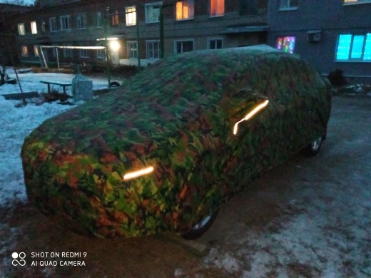 Доставка 2 недели. Брал для KIA SOUL SK3 2020 размер YM, наделось нормально, даже есть сзади небольшой запас - типа если бы запасной колесо висело сзади. Снаружи цвет камуфляж, внутри серебристый цвет, летом не солнце можно использовать сереьристый. 11.11.2020 стоило 2376руб.