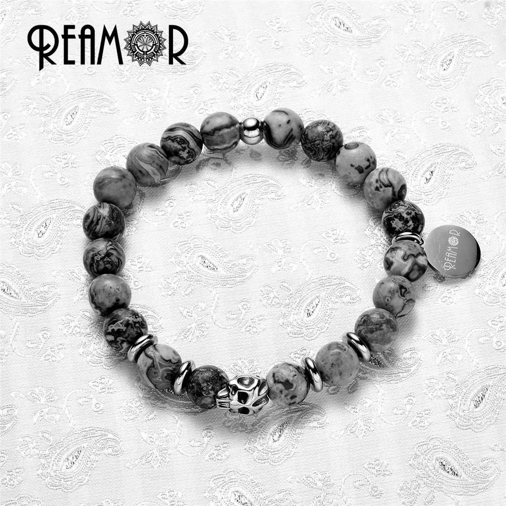 Браслет REAMOR из натурального серого камня в виде карты, браслет из нержавеющей стали с бусинами в виде черепа и логотипами, мужские браслеты из эластичной нити