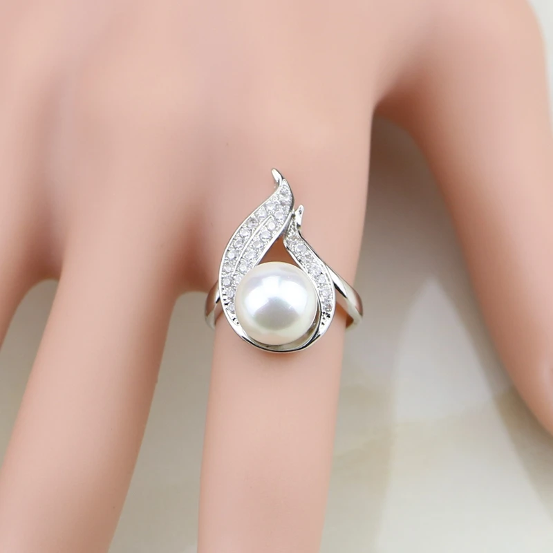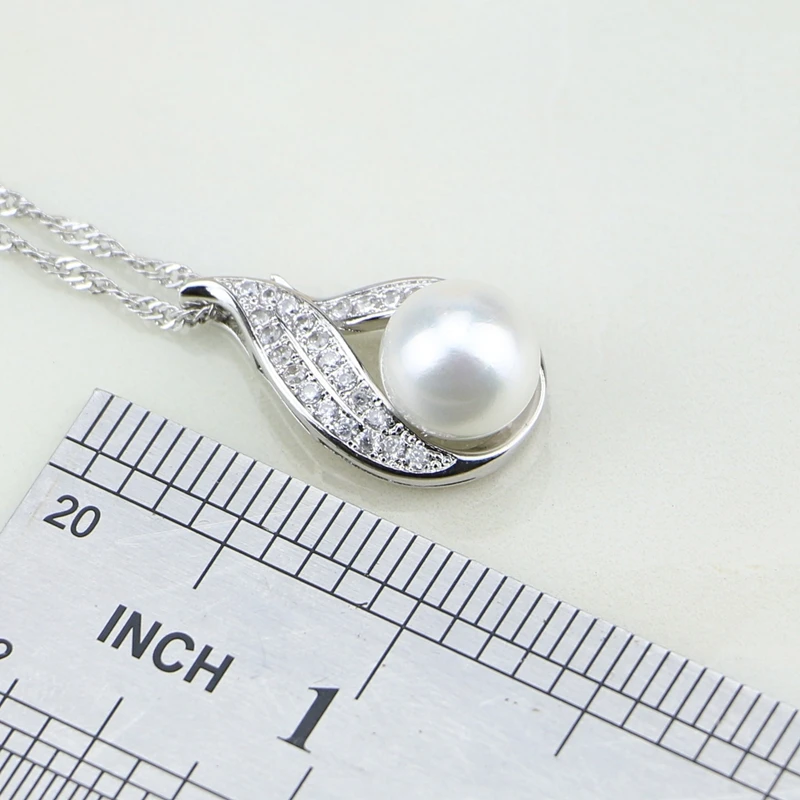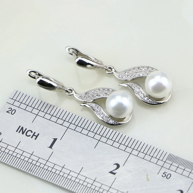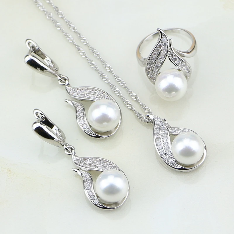 Огонь 925 Серебряные украшения белый жемчуг кубический цирконий комплект ювелирных изделий подарок для женщин серьгиКольцокулонколье цепь