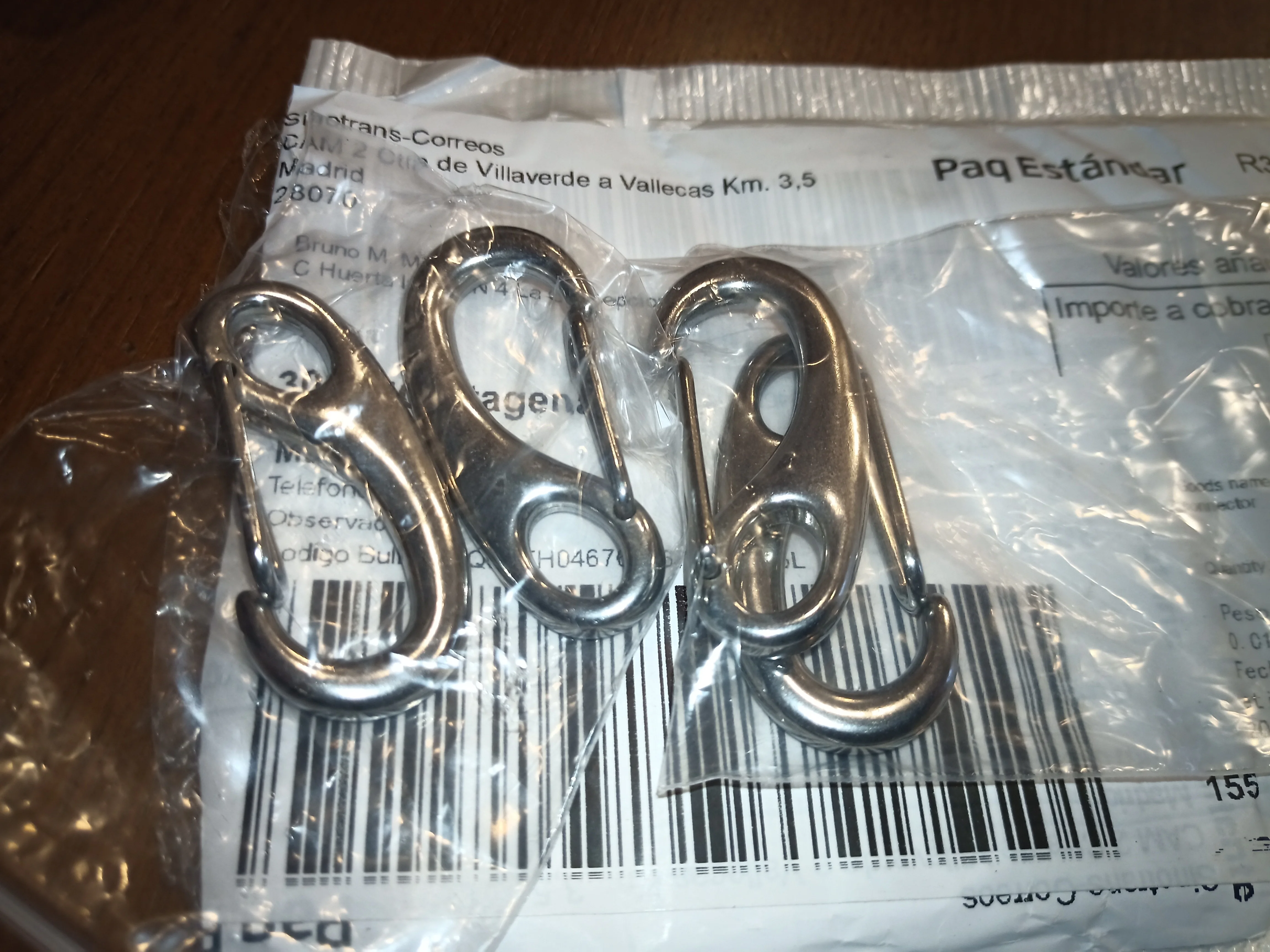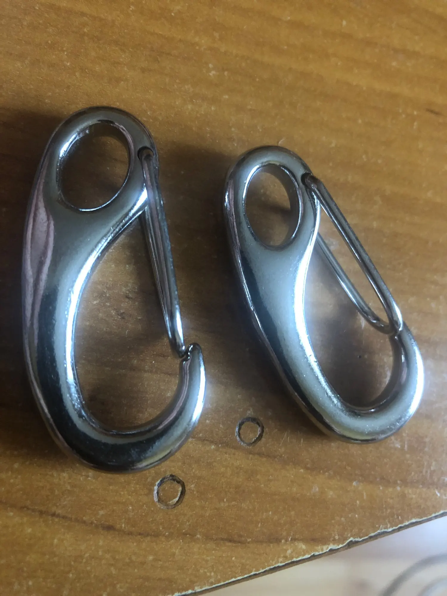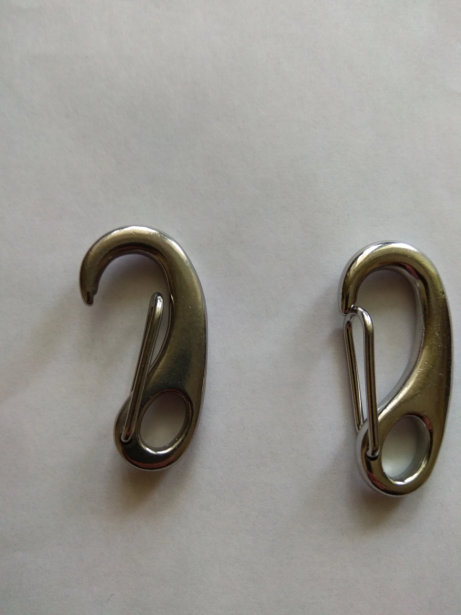 Карабины как на фото, только в одном защелка не возвращалась в исходное положение, и он по цвету немного отличался от своего собрата. Попробовал чуть смазать и разработать, вроде помогло, защелка-пружина немного жёстче, чем в другом, но иногда все равно клинит. Думаю разработается. А так норм, доставка 20 дней. Если не будет ржаветь , то супер.