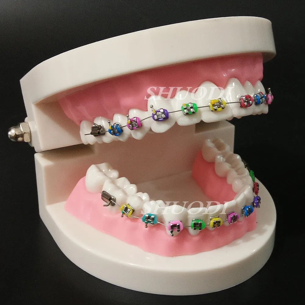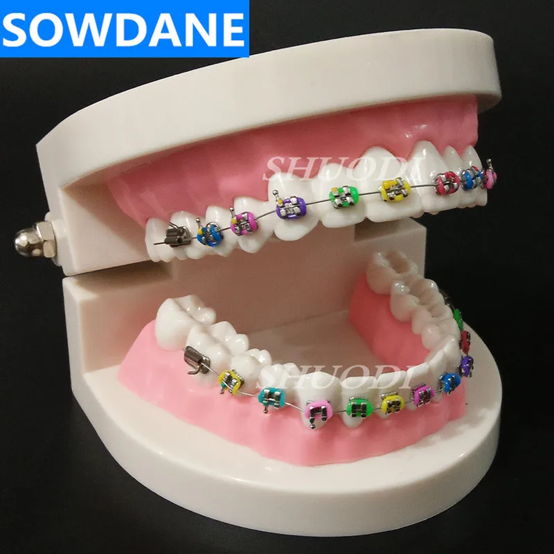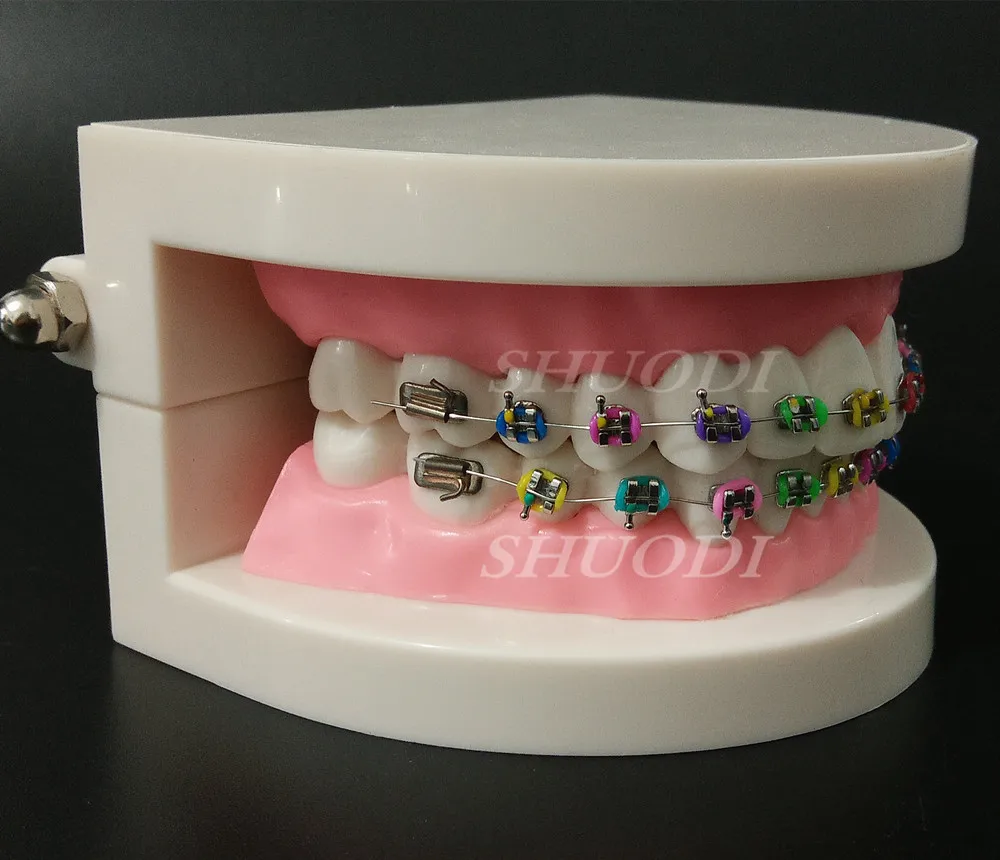Модель стоматологической ортодонтической терапии с Орто-металлическим кронштейном, дуговая проволока, буккальная трубка, лигатурные завязки, модель зубов