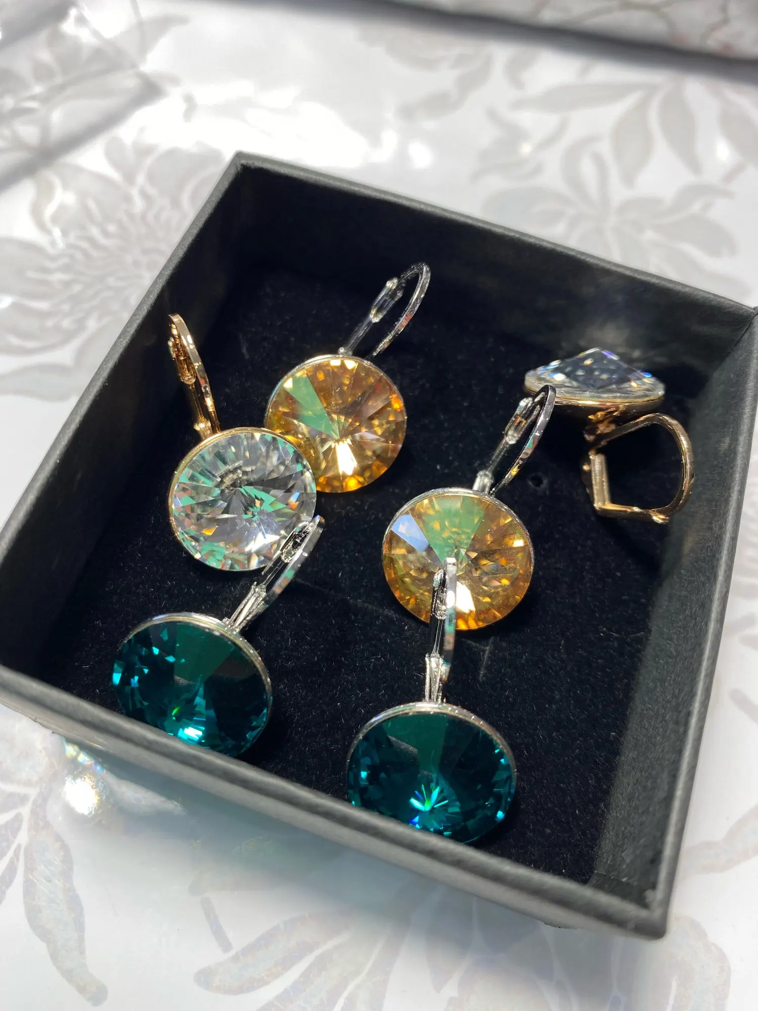 Заказ поступил примерно через месяц. Запакован был хорошо в пупырку и в коробочку, и в отдельных пакетиках. Серьги просто очень красивые. Кристаллы на дужках сидят пониже, чем у подобных серёжек у других продавцов. Дужки кажутся длиннее за счёт этого. Меня это устраивает. Мне кажется, что даже сверкают сильнее. Цвет насыщенный, яркий, зелёный похож на зелёнку)) Очень красивый. Фурнитура качественная. Кристаллы приклеены ровно. Без сколов и царапин.