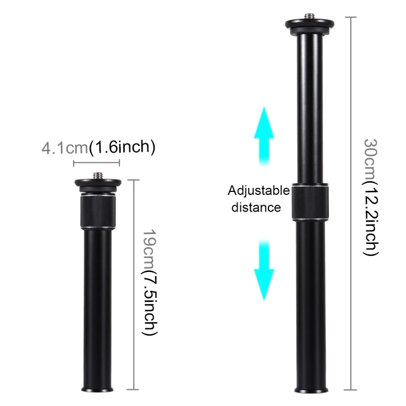 1. Высококачественные материалы и конструкция.2. Длину можно отрегулировать от 18,7 см до 31 см3. Регулируемый удлинитель, который доставляется куда угодно.4. С резьбовым креплением 3/8 дюйма в нижней части: можно крепить на штатив или подставку.