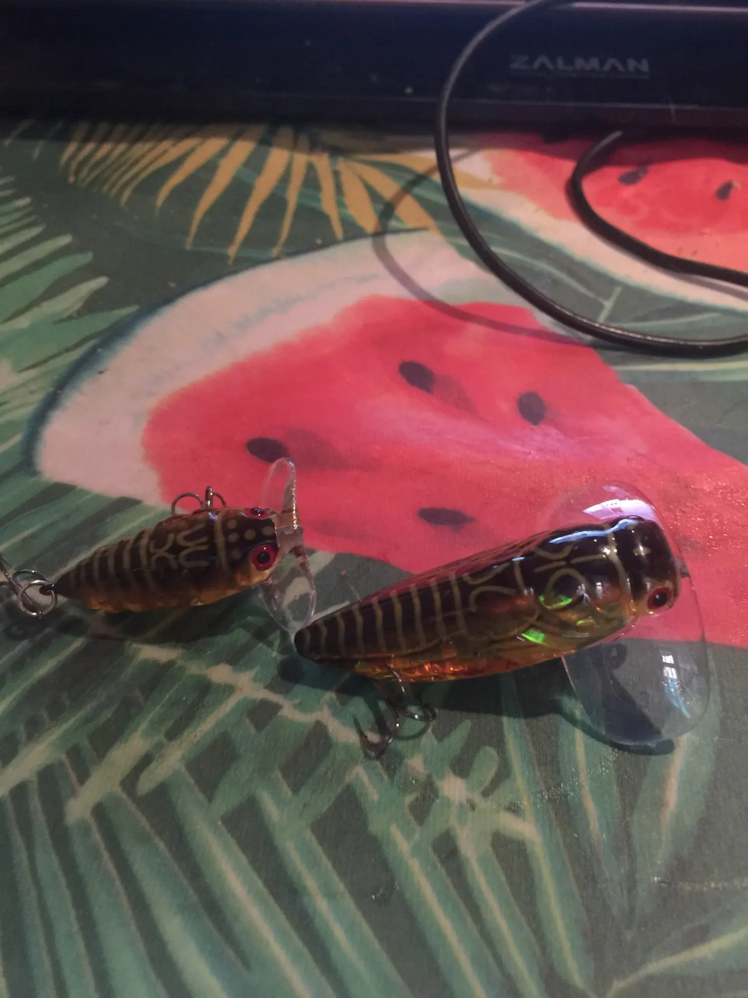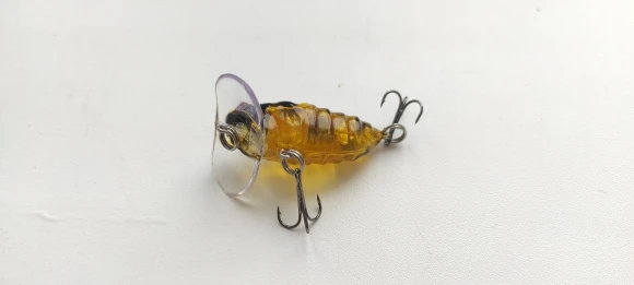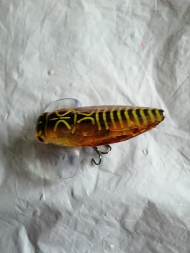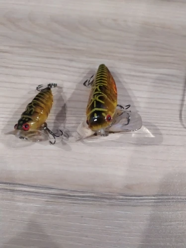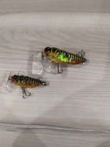 Цикада из прозрачного пластика. Не уверен, что будет работать. Крючки на 3, лучше заменить. Посмотрит в воде, может и ошибаюсь по работоспособности.