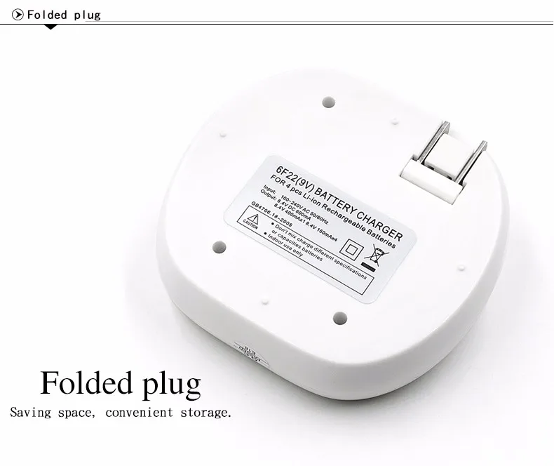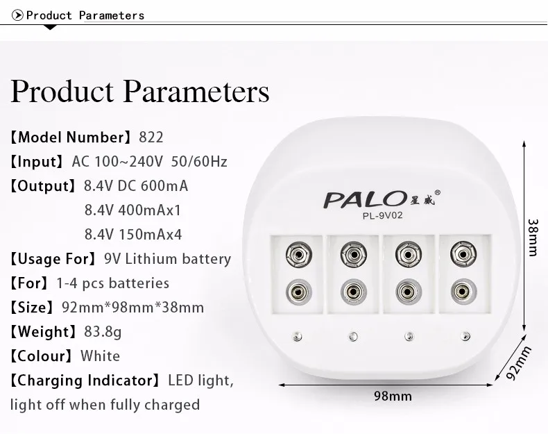 Это зарядное устройство может заряжать 1-4 шт 9 в литиевые, Ni-MH,NI-CD батареи. Более того, зарядное устройство использует технологию управления MCU, обеспечивая постоянную модель безопасности тока и постоянного напряжения. Свет выключится, когда батарея полностью заряжена. 1. Подходит для любого напряжения питания по всему миру.2. Это зарядное устройство использует технологию управления MCU, обеспечиваяПостоянный ток иНапряжение модель безопасности.3. Зарядное устройство зарядит аккумулятор при подключении, и индикаторСветовое отображение в синем цвете.4. Только зарядка для 1-4 шт 9 в литиевые, Ni-MH,NI-CD батареи, не заряжаются дляДругие типы батарей.Вход: 100-240 в перем. Тока Макс.: 100 мАВыход: 8,4 в постоянного тока 600 мАБез нагрузки потребляемая мощность: 1 Вт МаксМаксимальная потребляемая мощность при полной нагрузке: 5 ВтБатарея Chrge Rate: >90%Размер: 97,8 мм x 91,8 мм x 38,5 ммВес: 90 г Пакет включает в себя:1 шт. * 9 в зарядное устройство4 шт * 9В литий-ионные аккумуляторы1 шт. * Спецификация зарядного устройства