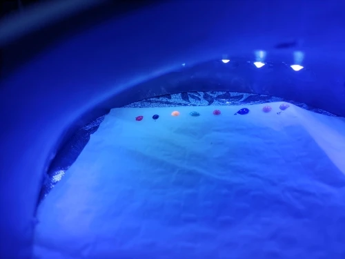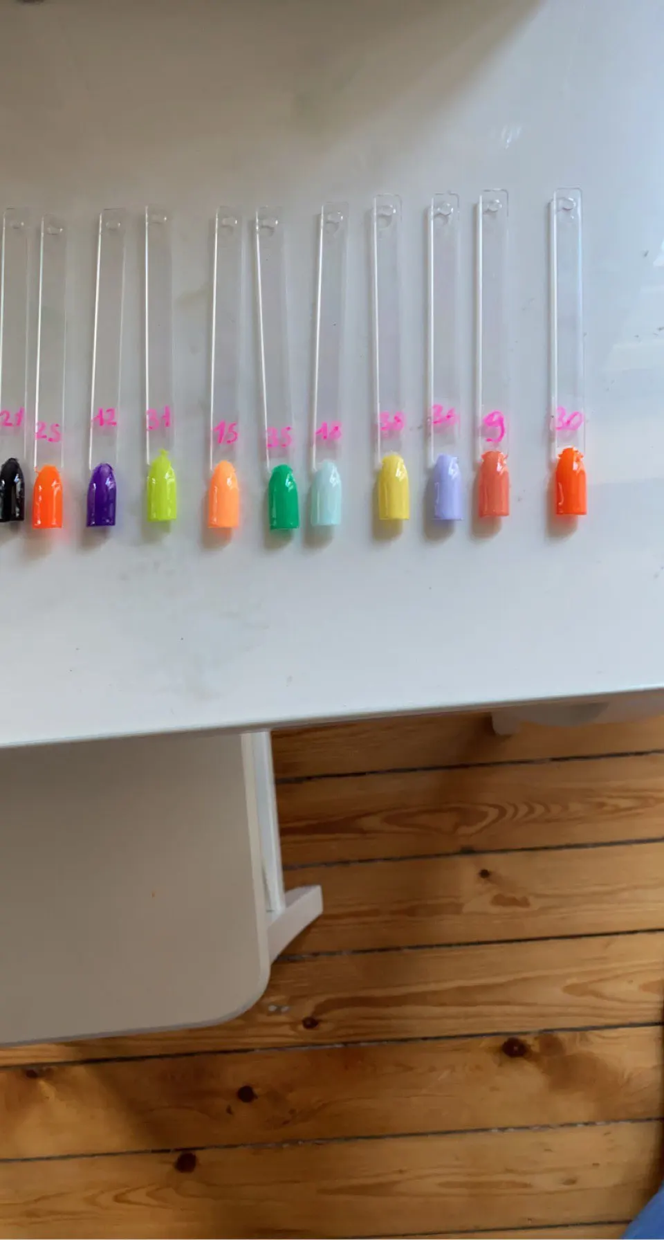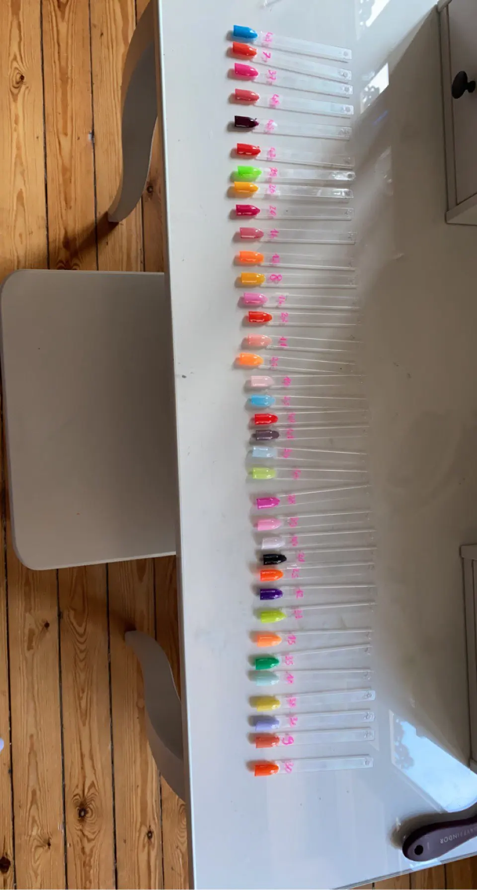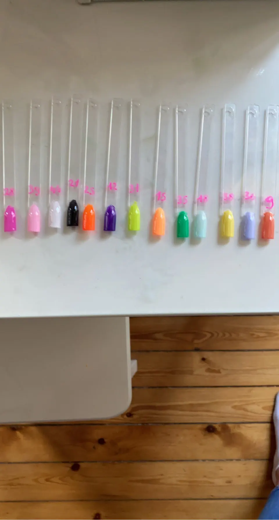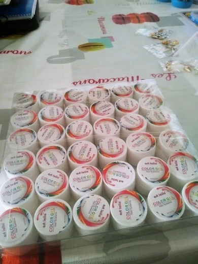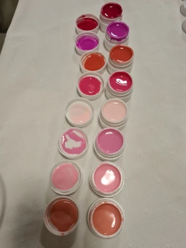 빨강 주황 핑크비율이 압도적으로 많음 알고사서 만족함 배송 1.26-2.03 발색력 컬러마다 다르지만 대부분 쨍해서 만족 싼가격에 많은컬러를 원하면 사고 발색력이 우선이면 고민해보세요 그리고 뚜껑에 무슨색인지 몰라서 하나하나 바르고 탑젤까지 올림