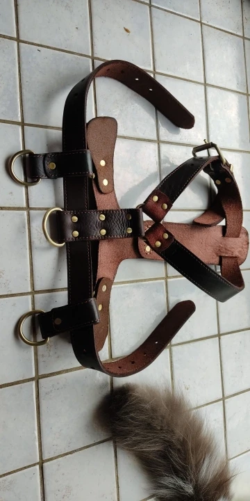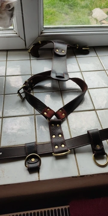 Very nice dog harness. Thick leather, well made. Buckles and rivets well made. I am positively impressed