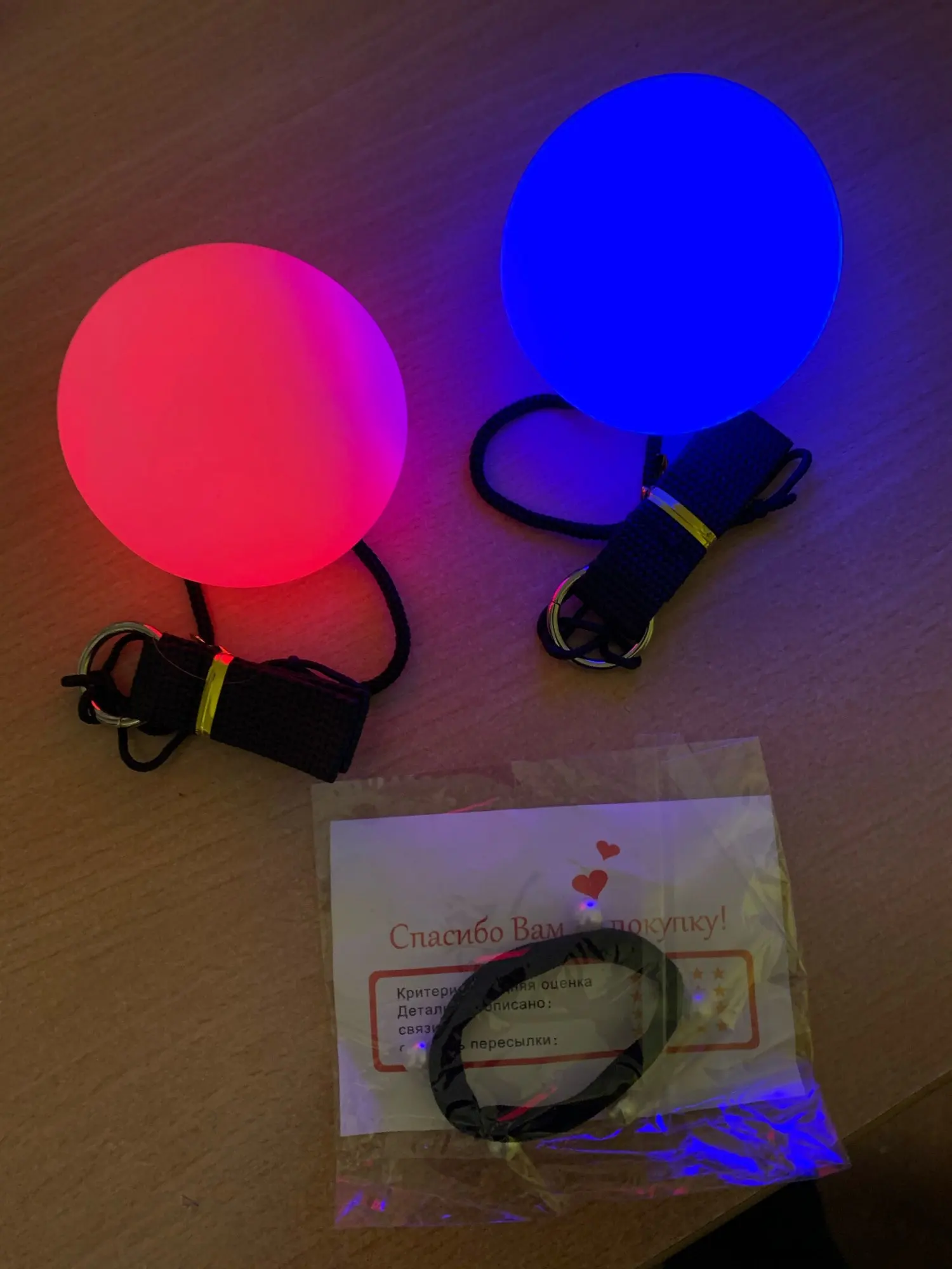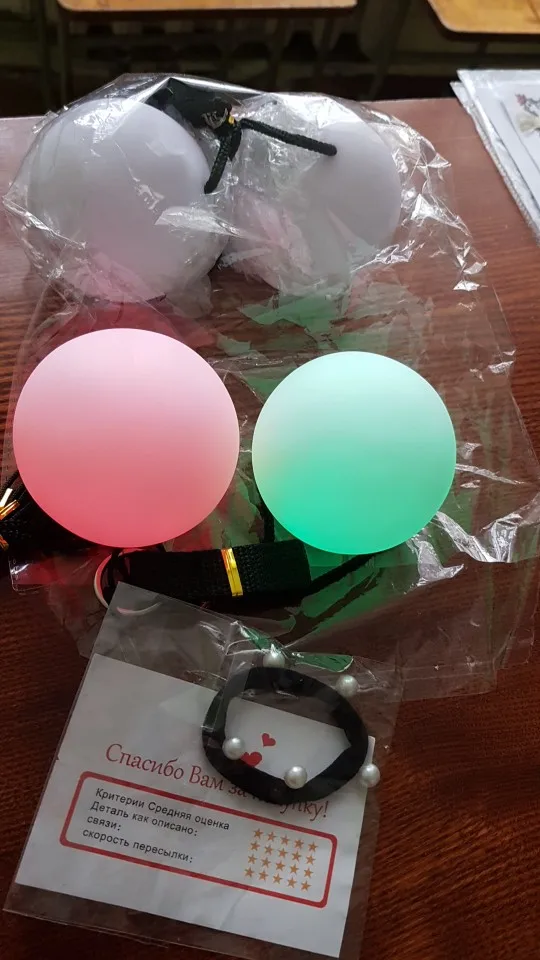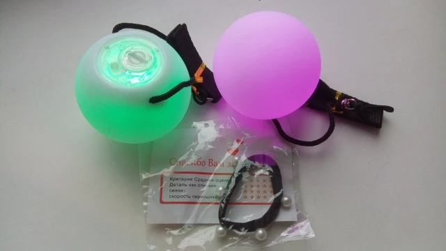 Товар соответствует описанию. Шарики мягкие, что удобно при обучении. Верёвки не длинные, их можно регулировать или заменить. Есть несколько режимов цвета. Недостаток - химический запах. В комплекте была резиночка для волос.