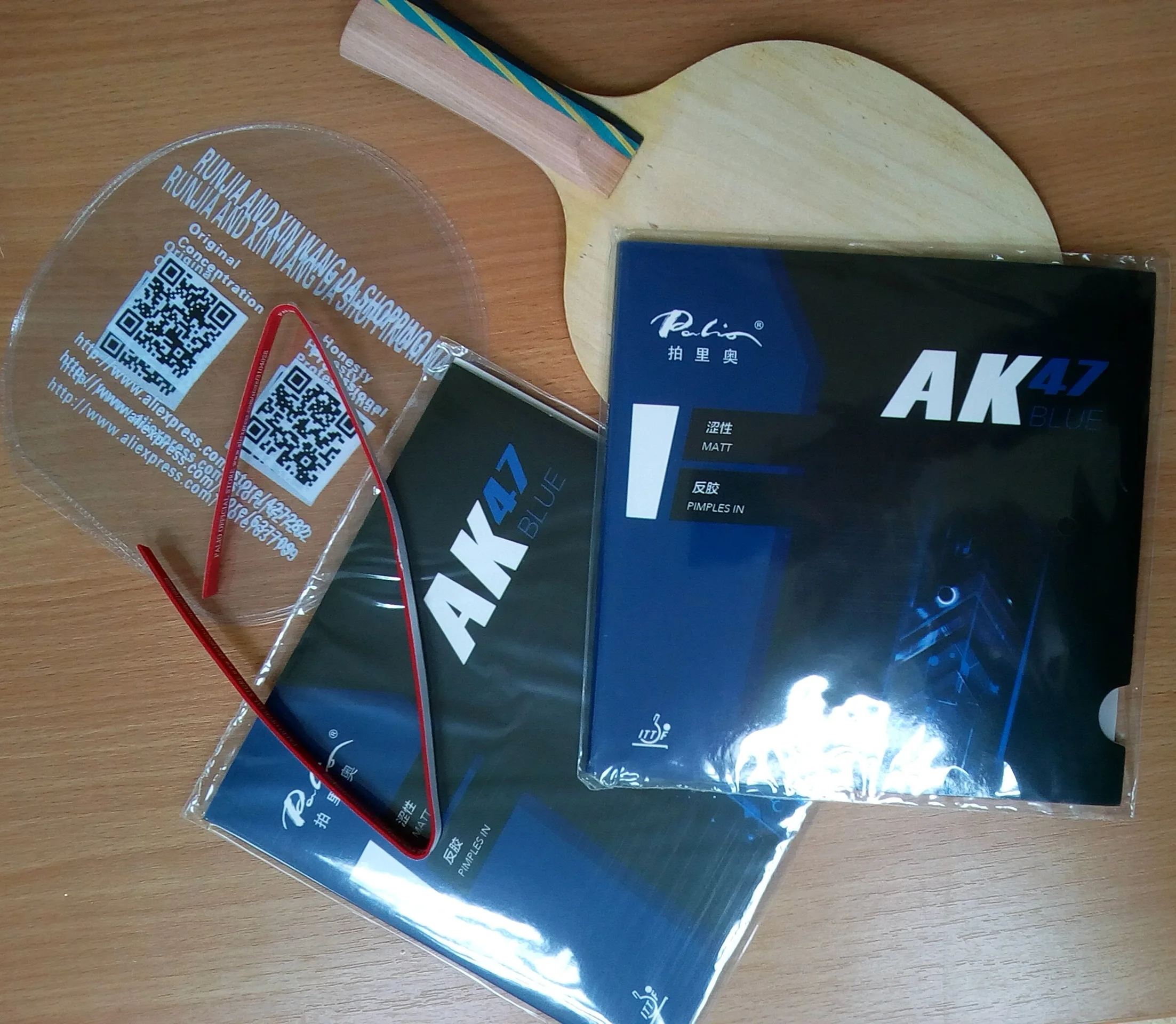 Заказывал основание TS1 и к нему накладки АК-47 red и blue. Попросил продавца выбрать самое легкое основание и собрать ракетку. В итоге пришла аккуратно собранная ракетка массой 165 грамм, в чехле, с защитными пленками для накладок, губкой для очистки и дополнительной торцевой лентой. Упаковка отличная. Доставка заняла 24 дня, ракетка пришла накануне Всемирного дня настольного тенниса. Праздничная тренировка с новой ракеткой доставила много радости, я доволен.