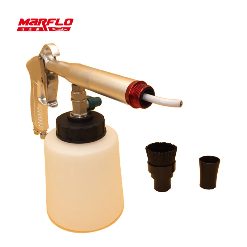 Инструмент для внутренней очистки Tornador MARFLO-пневматический пистолет-распылитель для всасывания, который очень мелко распыляет мыло, воду и воздух и распределяет его под высоким давлением. Он быстро удаляет грязь и использует более низкое потребление чистящего средства (супер мыло Tornador). Новый ly Разработанный Набор вращения в сопле нового Tornador MARFLO более мощный и очищает быстрее, чем оригинальный инструмент для очистки интерьера Tornador. Нет износа роторного шланга и воронки, так как средний направляющий подшипник не контактирует с насадкой.
