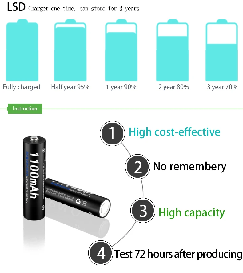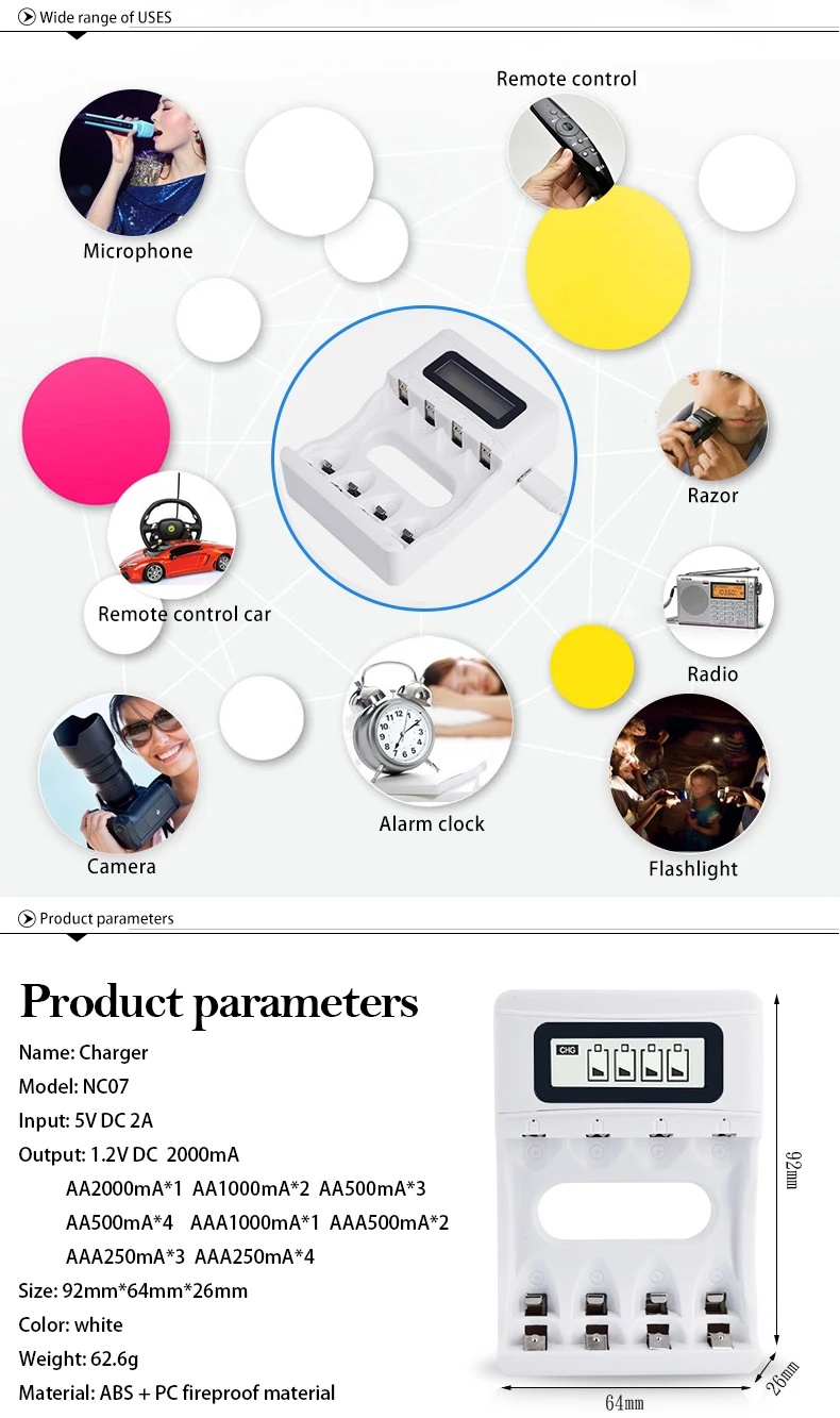 Основанный группой старших инженеров в области перезаряжаемых батарей и зарядных устройств, Evtope является первоклассным профессиональным производителем перезаряжаемых батарей и зарядных устройств. Наша беспроблемная гарантия гарантирует быстрое и беспроблемное обслуживание, когда вам это нужно.Совместимые батареи:Зарядное устройство AA AAA Ni-MH Ni-Cd аккумуляторные батареи.Спецификация продукта:Вход:5V DC 2AВыход:AA 2000mA x 1 1000mA x 2 500mA x 3 500mA x 4AAA 1000 мА x 1 500 мА x 2 250 мА x 3 250 мА x 4Размер: 95 мм x 65 мм x 30 ммВес: 100 гВнимание:1. Условия использования: от 0 ℃ до 40 ℃, это нормальное явление, что аккумулятор нагревается комнатной температуры во время зарядки.2. Убедитесь, что аккумулятор установлен правильно: Убедитесь, что +/-полюс аккумулятора совпадает с +/-полюсом зарядного устройства.3. Никогда не смешивайте зарядку разных типов и разную емкость аккумуляторов под одним и тем же светодиодным индикатором.4. Не разбирайте и не собирайте зарядное устройство самостоятельно по соображениям безопасности.Список пакетов:1 зарядное устройство1 х USB кабель1 х Руководство пользователя4 перезаряжаемые батареи AAA1 х батарейный отсек