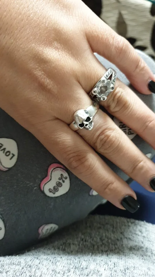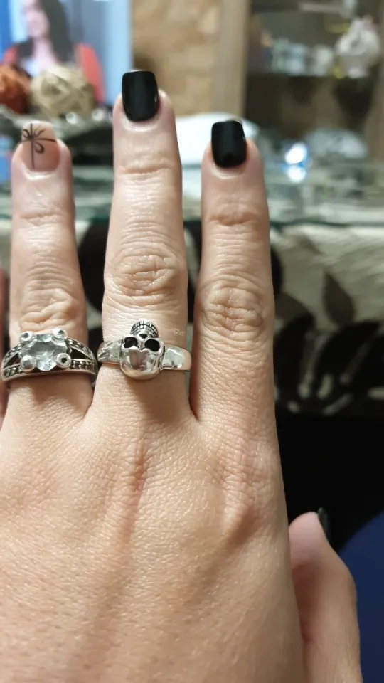 Красивое кольцо, точно такое же, как на фото. Выглядит серебристым. Купил размер 11 для моего указательного пальца, который немного пухленький (используйте a. 25 в Бразилии) и был немного великоват, но служит. Отличная покупка стоит того.