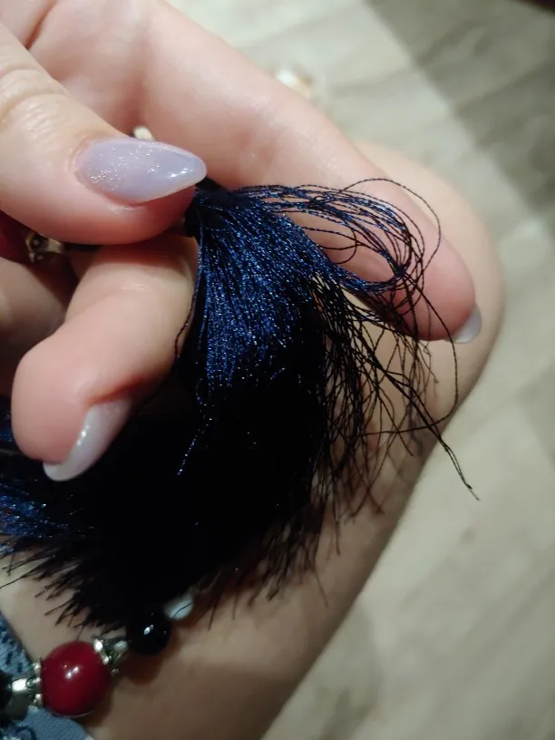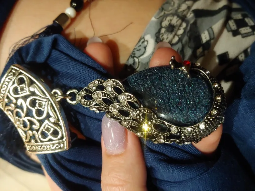 Шарф тонкий, похож на трикотаж. Края по длине не обработаны. В месте приклеивания шарфа к кисточкам виден клей. на одной из кисточек видны петли из нитей. Пришлось подрезать их. Центральный медальон хороший, качественный. Павлин металлический инкустирован камешками. Большой камень похож на акрил, внутри блестит красиво. Нюансы доработала и подшила. Вполне устраивает. Рекомендую.