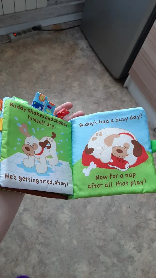 прекрасная книжка) забавный человечек все шуршит малыш ещё не понимает, заказывала на будущее но уже смотрит, пупсика держит) надеюсь поможет нам )))) вообще идея крутая сама книжка большая что радует и мягкая легко постирать вручную