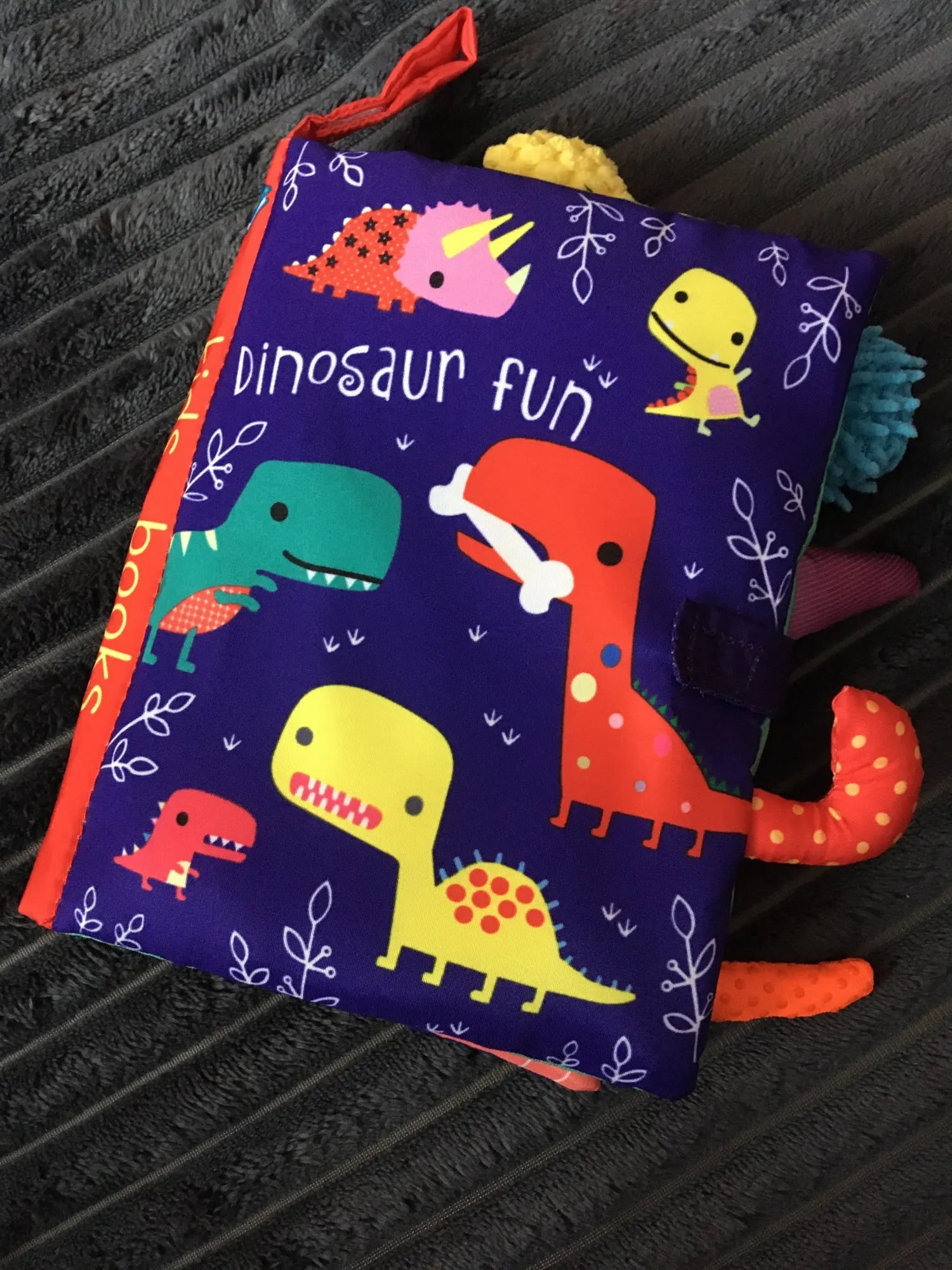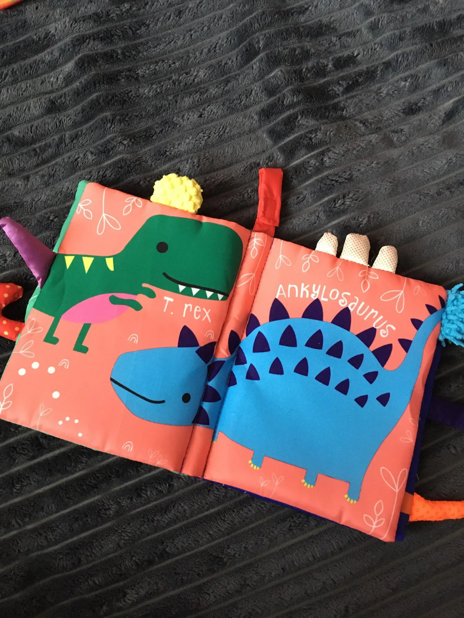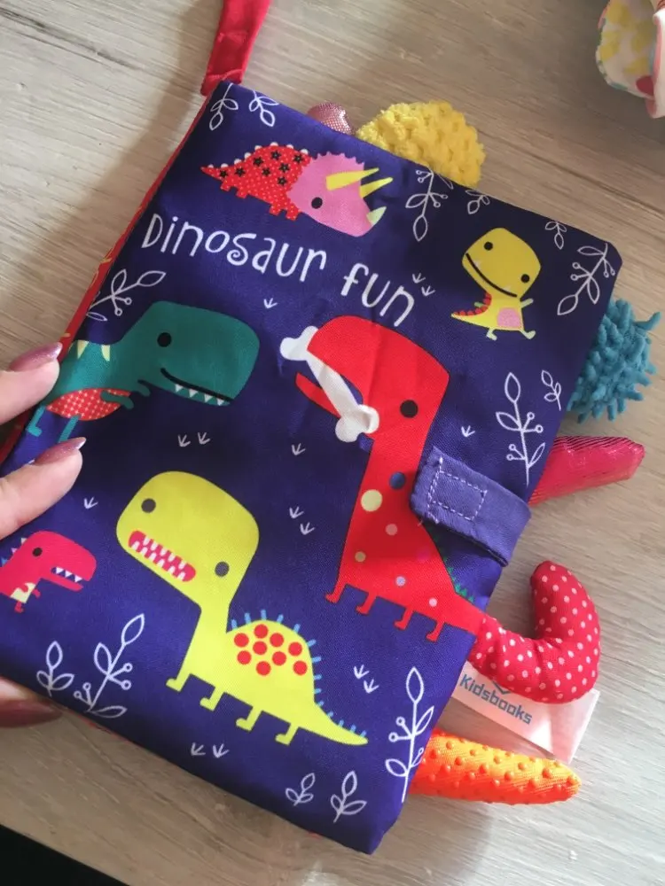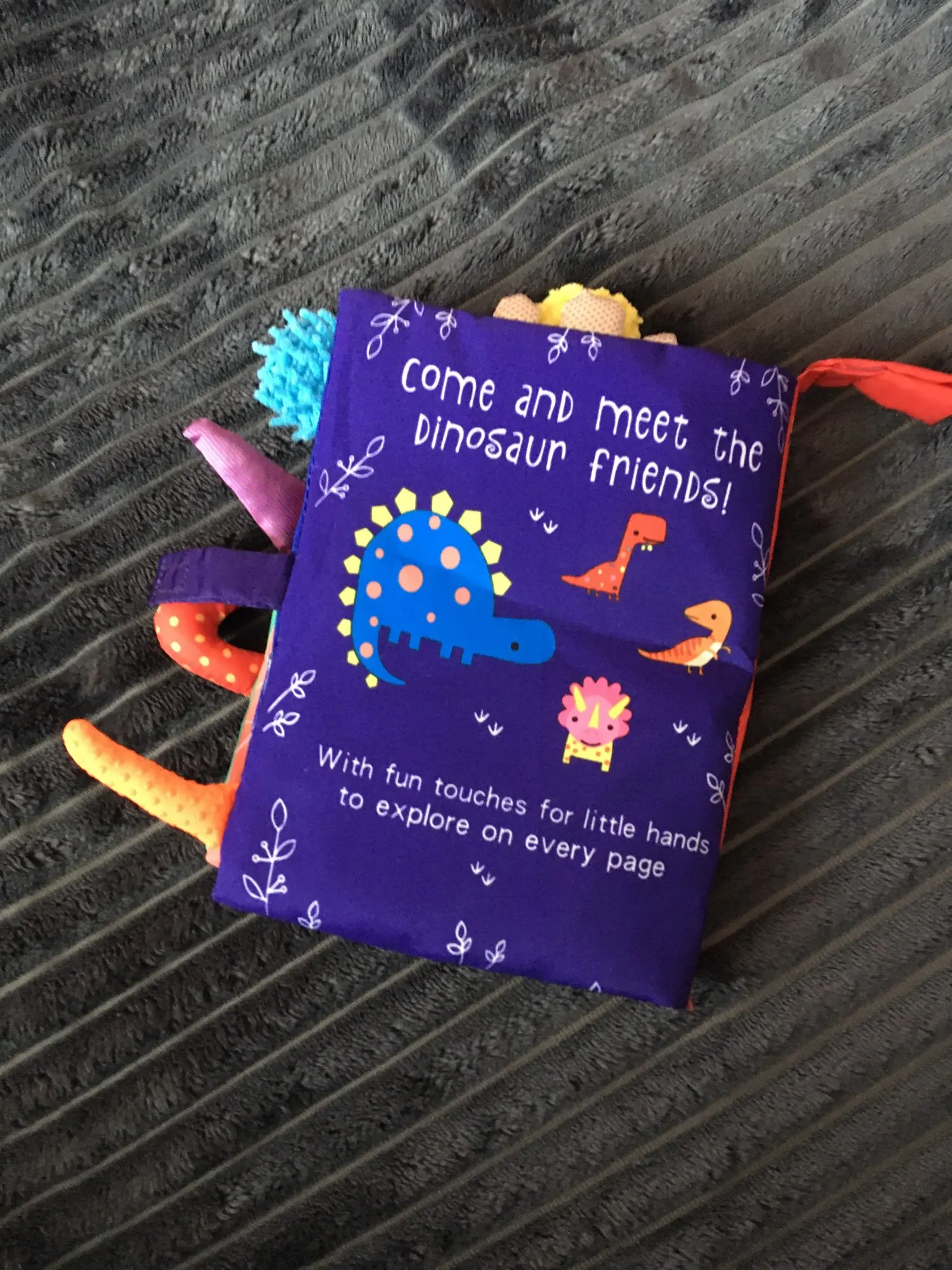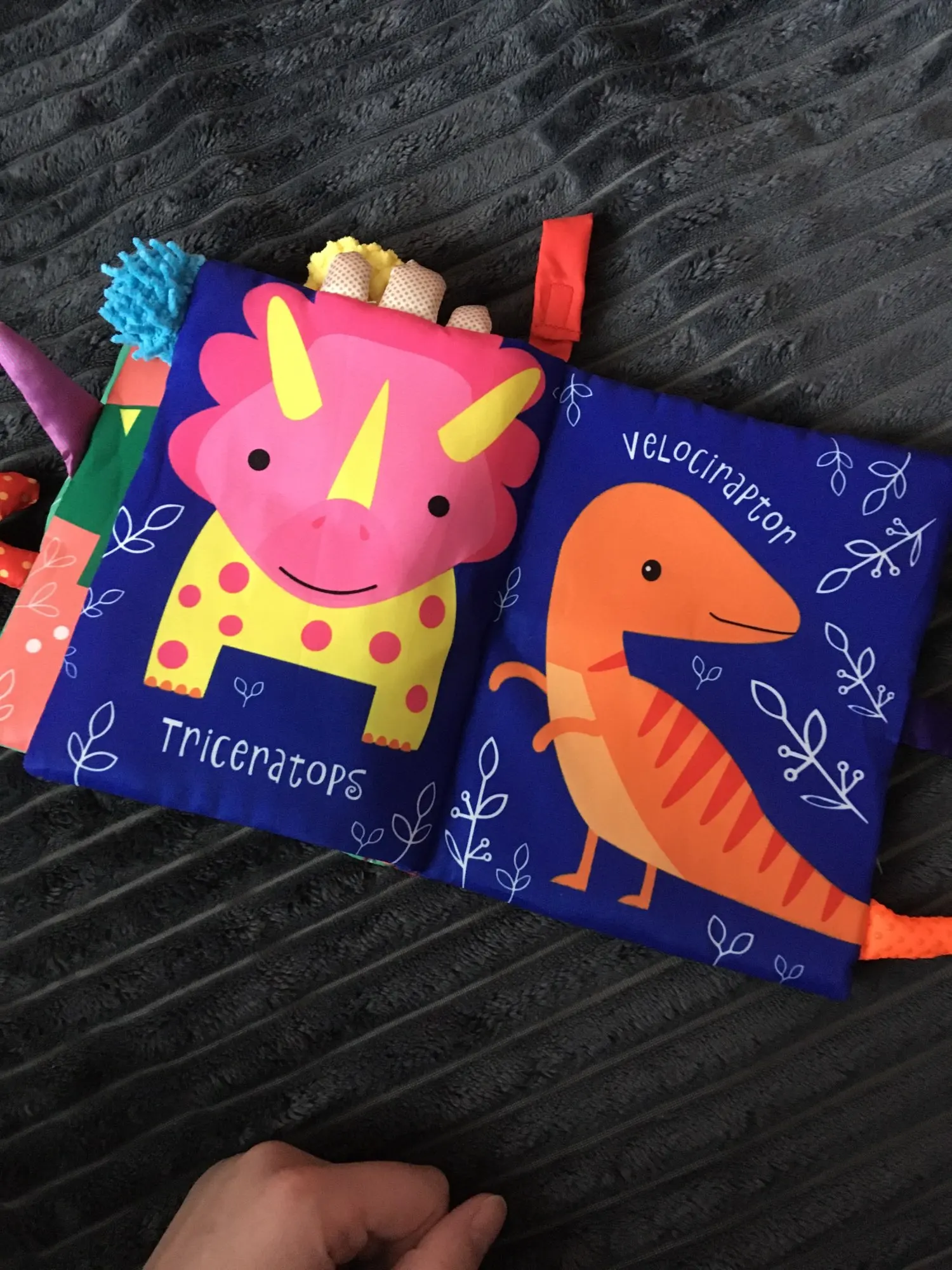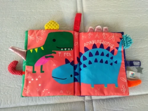 Книжка классная. Динозавры милые. Рядом с ними есть их название. У каждого динозавра есть хвост или гребень который можно потрогать это для развития мелкой моторики. А моему ребёнку 2,5 года. И он сказал, сама мама играй со своими динозаврами. Так что сижу играю