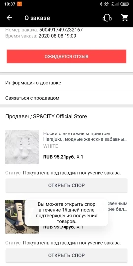 Я не подтверждала получение товара, спор открыть не могу уже давно, носки так и не пришли, заказ был оформлен более 3х месяцев назад, уже не в первый раз от этого продавца не приходят посылки, до последнего надеялась, что хоть в этот раз придет Ставлю 4 звезды, чтобы отзыв наверняка опубликовали