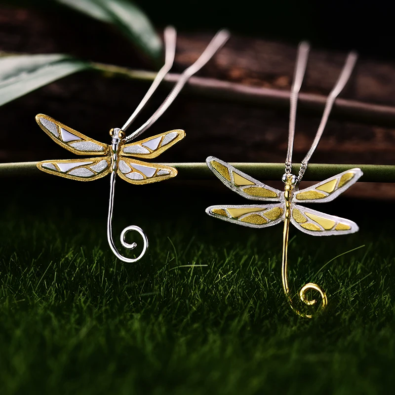 Lotus весело Настоящее стерлингового серебра 925 природных Стиль ручной работы Fine Jewelry милый Стрекоза кулон без ожерелья для женщин