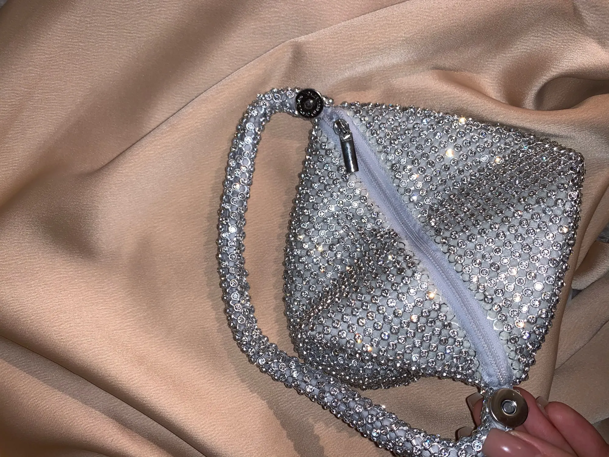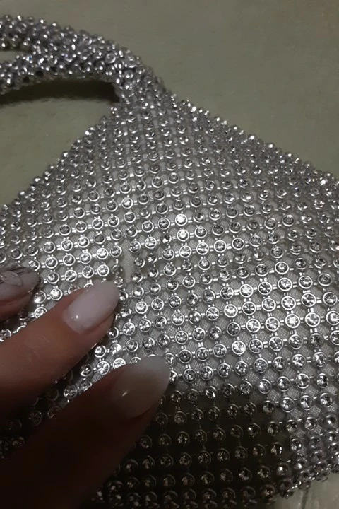 Блестючий, красивый) сетка страз не дубовая, переминается в руке. Клатч маленький - смартфон шаоми 7.5×15 см не влез. Помада, ключи, карточка влезут) и похоже надо приобрести кнопочный винтажный телефончик для торжественных мероприятий, такой влезет))