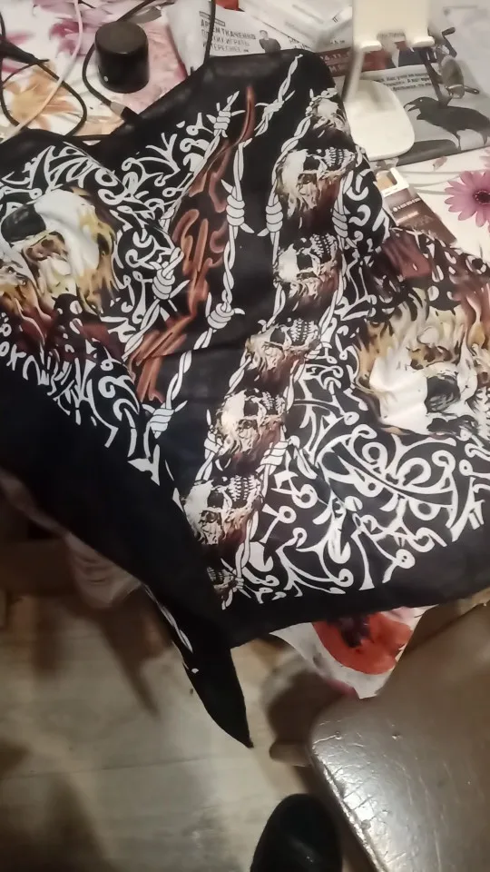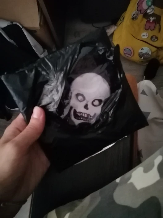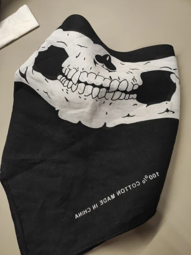 пришло в мск за три недели. соответствует описанию. ХБ, но принт немного подванивает, надеюсь после стирки уйдет. если использовать в качестве намордника, то принт черепа достаточно большой, с мордой лица не совпадает. буду заказывать ещё!