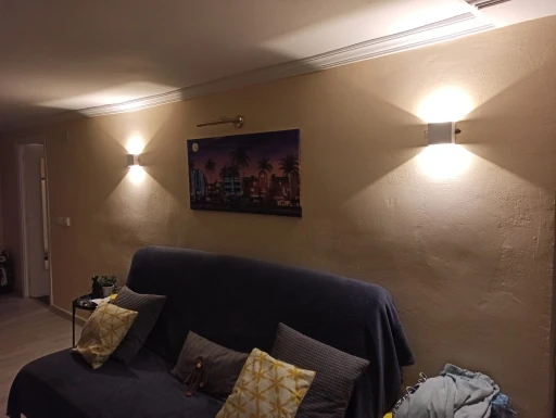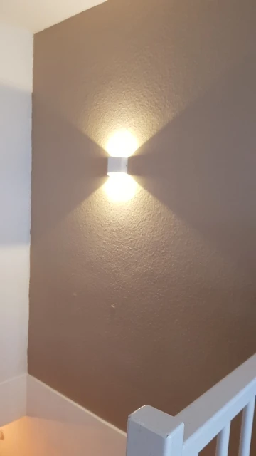 Лампа Довольно Милая, и всем нравится дизайн. К сожалению, теплый белый не очень теплый, я даже думал, что продавец доставил холодный белый, но он сказал, что это должен быть теплый белый. К сожалению, моя коричневая стена компенсирует цвет света. Диммер довольно большой, что делает его странным в оригинальных стеновых блоках (ЕС), см. Изображение.