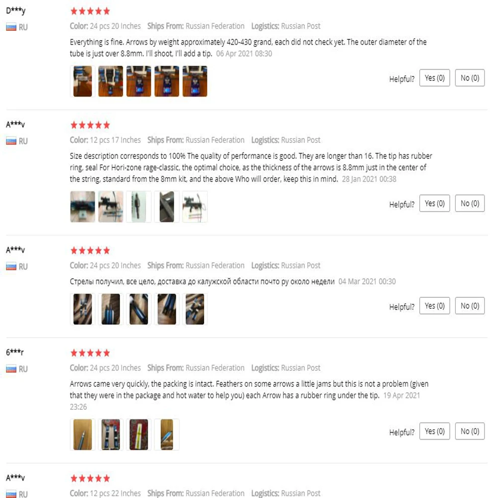 Стрелы получил. Товар соответствует описанию. Очень быстрая доставка. Вызывает сомнение оперение, оно мягкое и поэтому многие деформированные, не знаю насколько это критично.