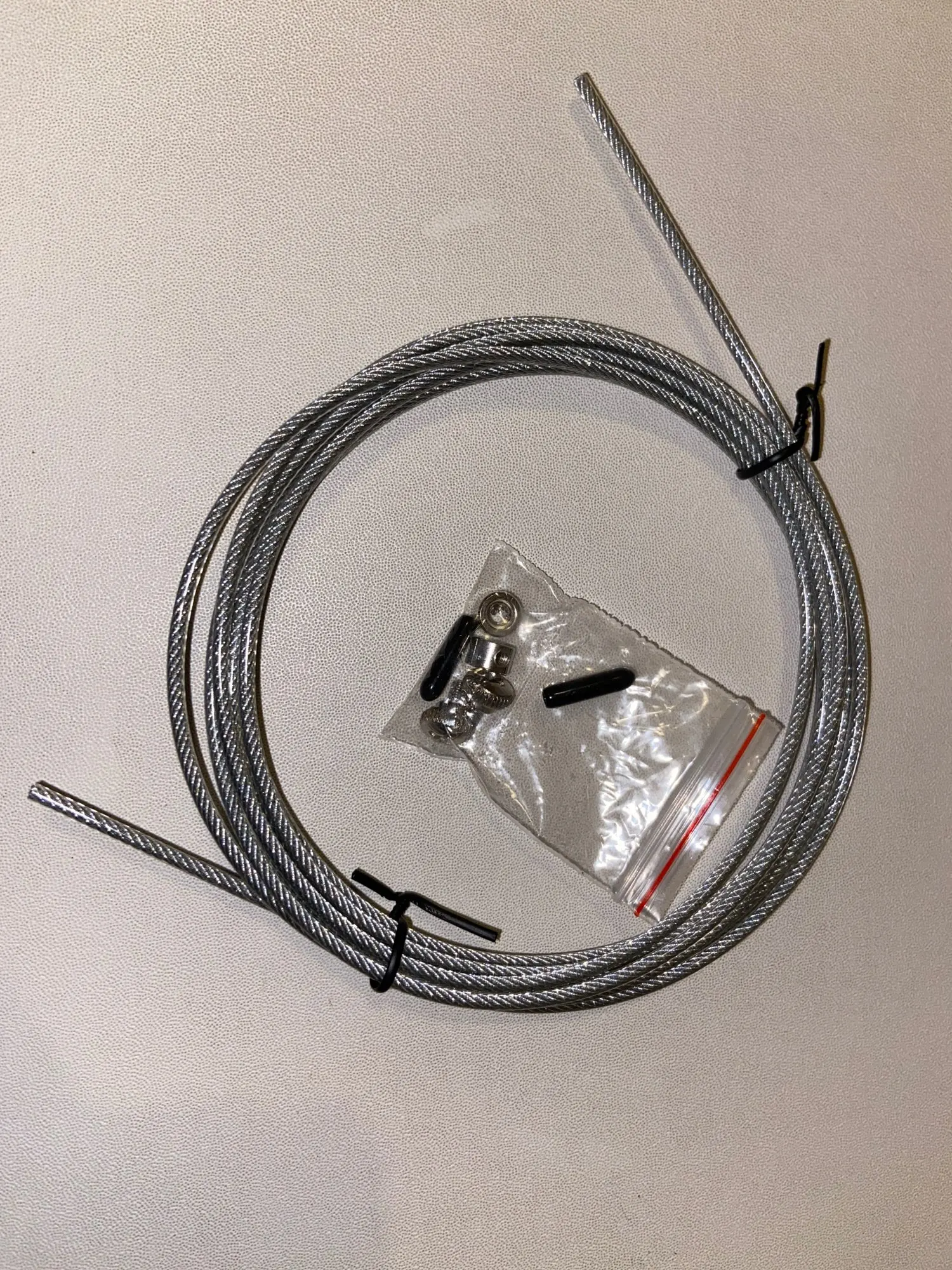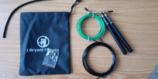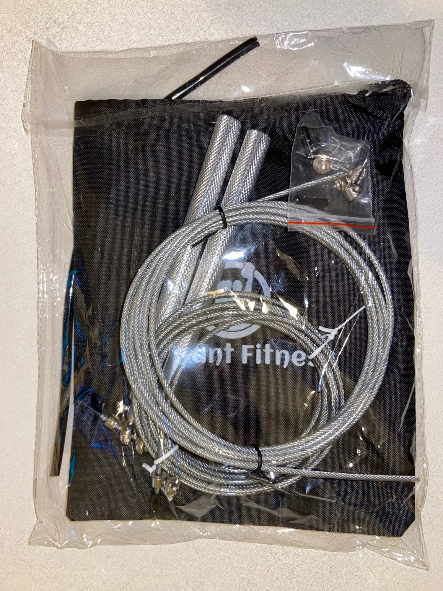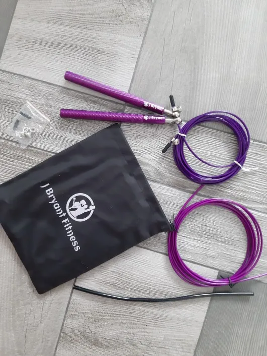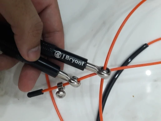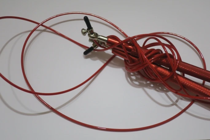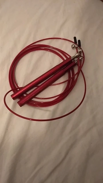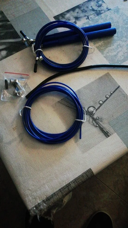 Скакалка металлическая (ручки - алюминий, тросик - железо в прозрачной резине). Не тяжёлая, приятная на ощупь. Один из подшипников был зажат - плохо вращался. Пришлось разработать. Надеюсь это только у меня такой брак. После разработки подшипника никаких проблем нет.