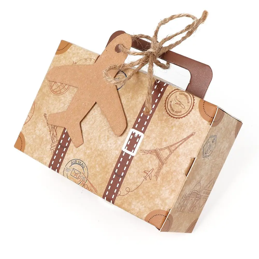 Подарочная коробка для путешествий с дизайном чемодана, элегантным стилем, интегрированной структурой, двусторонней печатью, завязанной двойным, натуральным шпагатом. Идеально подходит для подарочной коробки для гостя и для юбилея, свадьбы, дня рождения, детского душа