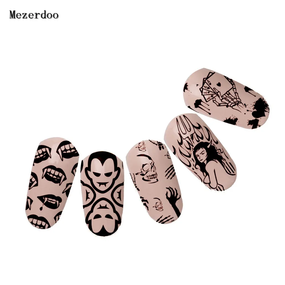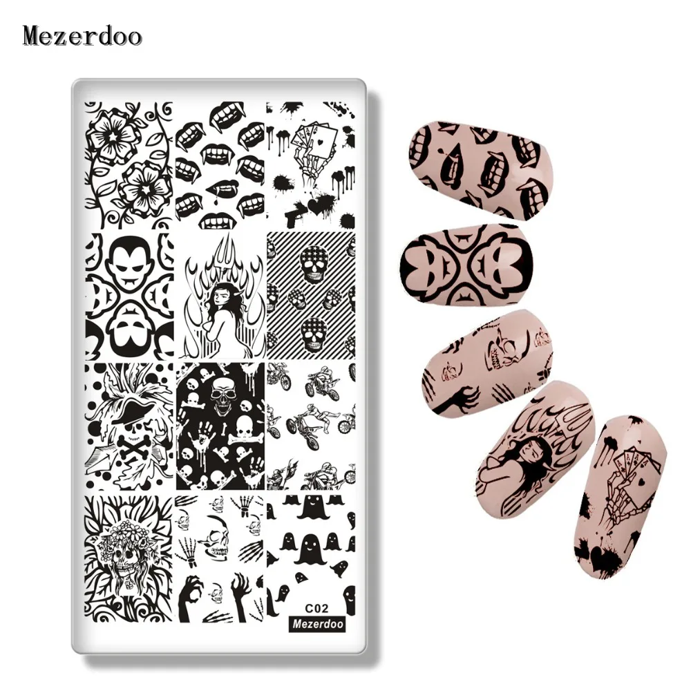 Mezerdoo Хэллоуин вампир ногтей штамповки пластины череп кровянистый зуб изображение штамповки ногтей маникюр шаблон ногтей штамп инструмент C02