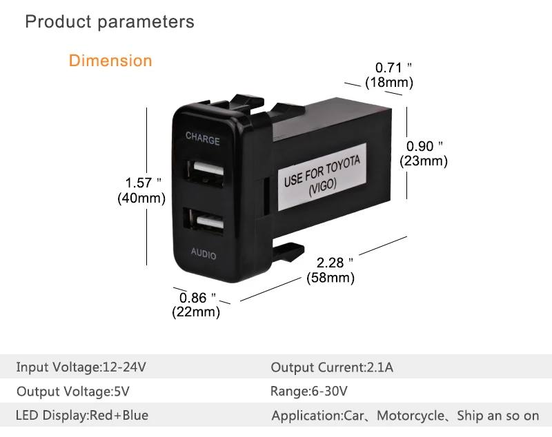 Особенности:100% уникальный дизайн, удобный в использовании.1:1 соответствии с соотношением оригинального автомобильного интерфейса.1 USB 5V 2.1A разъем для зарядки, 1 USB разъем для аудио входа.Может дать источник питания для телефона, планшета и т. Д.Специальный дизайн для Toyota VIGO.Маленький размер и отличная производительность.Прост в установке и удобен в использовании.Спецификация:Материал: АБС-пластикРазмер: прибл. 2,2*4*5,8 см (проверьте наши фотографии)Выход: 5 в 2,1 А (макс.)Посылка Вес: 73g/2,6 ozПосылка включает:1 x Двойной USB разъем для Toyota VIGOОбратите внимание:Из-за ручного измерения размер может отличаться на 1-2 смИз-за различных мониторов цвет может отличатьсяИз-за длительной доставки товар может быть поврежден при транспортировке, если товар поврежден, пожалуйста, свяжитесь с нами, прежде чем оставить отзывы, спасибо за понимание