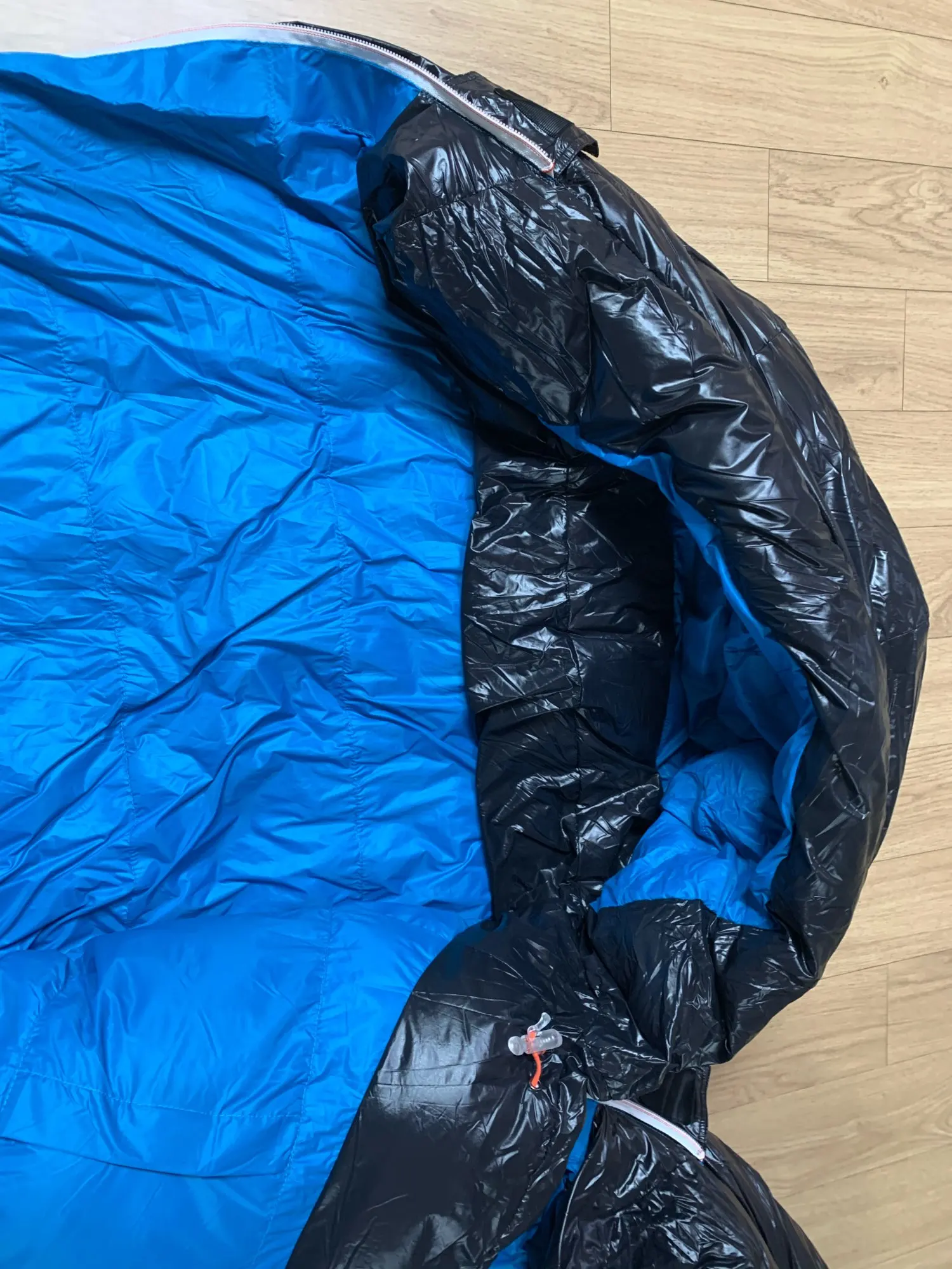 La livraison annoncée fin novembre est arrivée fin décembre, malheureusement après Noël. Le sac de couchage à voyagé un mois et demi dans son enveloppe de compression. Il est arrivé très écrasé et je pense qu'il n'a pas complètement regonflé depuis 5 jours qu'il est déballé. La construction est correcte mais je regrette qu'il n'y ait pas un bourrelet de plume derrière la fermeture éclair ce qui devrait créer un pont thermique. Je ne prévoirai pas une nuit à 2° sans prendre de précautions supplémentaires.