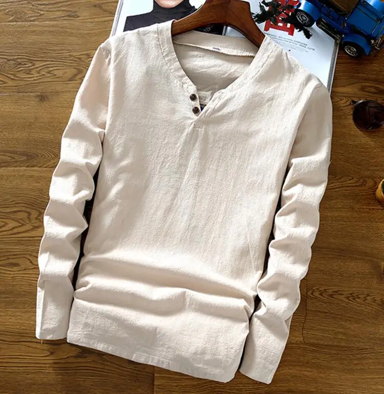 Мужская льняная рубашка с длинным рукавом и воротником-стойкой