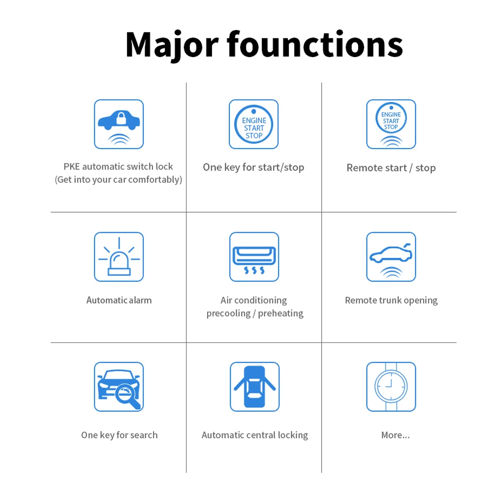 1 шт. основной блок, 1 шт. кабель запуска, 1 шт. основной кабель, 1 шт. Автомобильный ключ для часов, 1 шт. смарт-ключ, 2 шт. антенны PKE, 1 шт. кнопка остановки запуска, 1 шт. BT модуль, 1 шт. светодиодный светильник, 1 шт. цветная коробка.