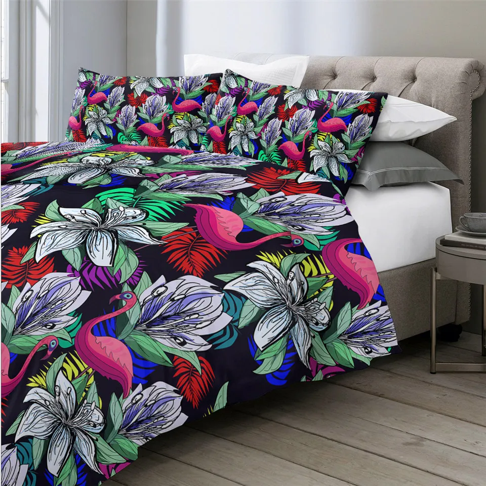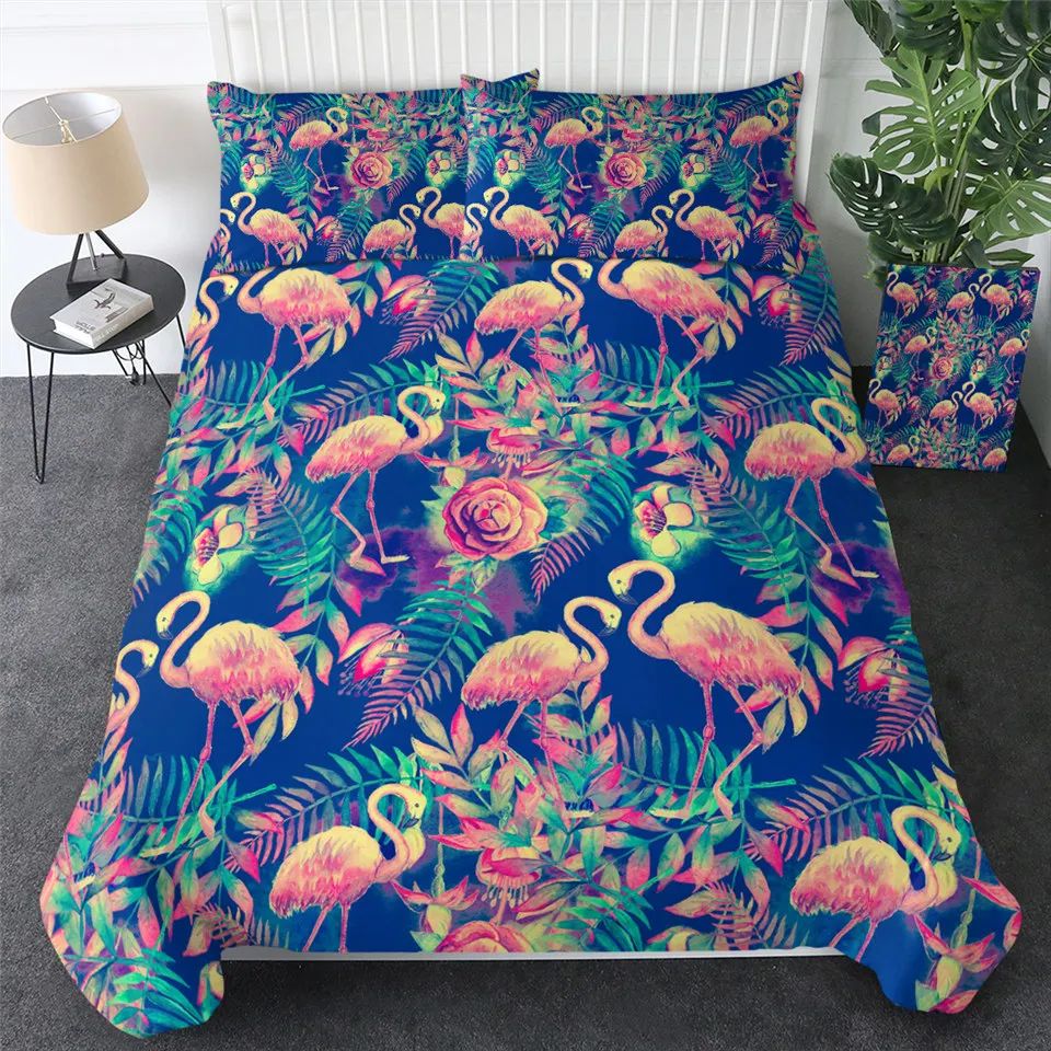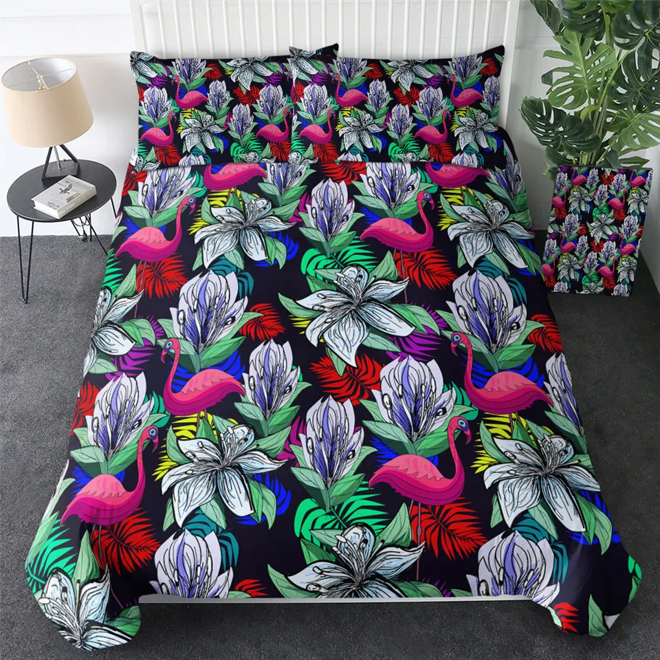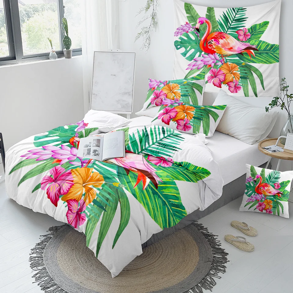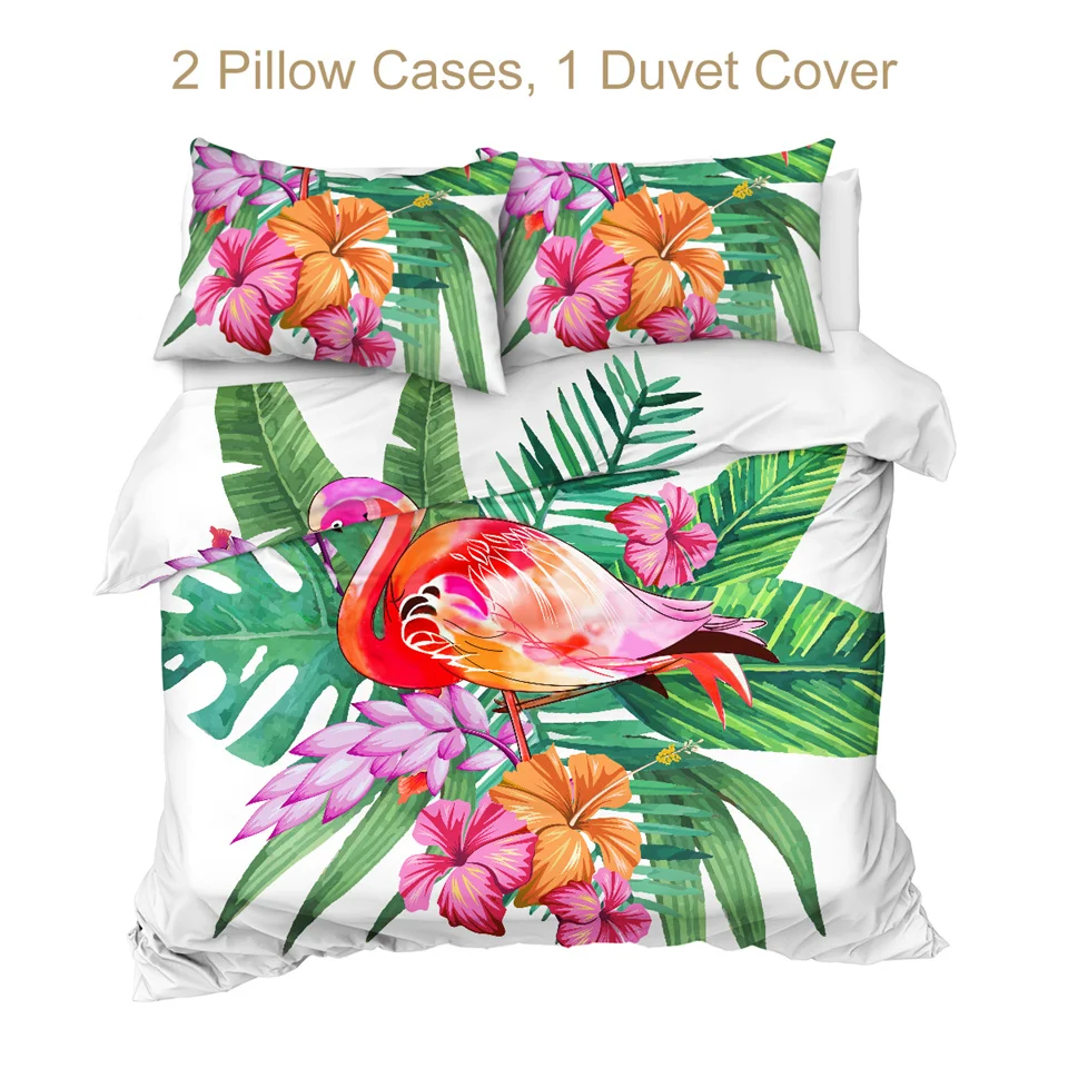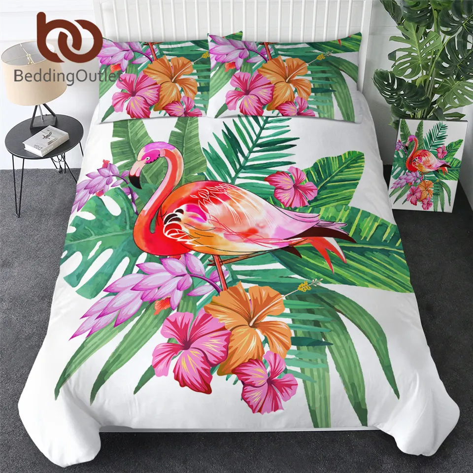 Комплект постельного белья BeddingOutlet с изображением фламинго, тропических растений, пододеяльник, Комплект постельного белья для дома, с цветочным принтом, розового и зеленого цветов, 3 шт.