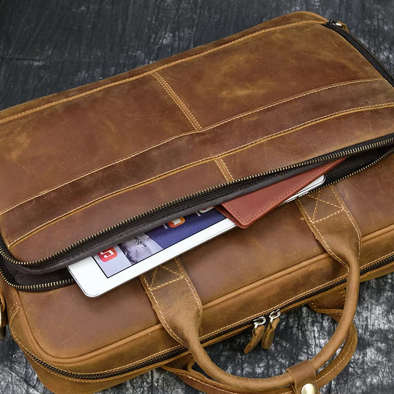 Материал: телячья кожа/натуральная кожаРазмер: 37*11*26 см (Д * Ш * В)Цвет: коричневый/темно-коричневыйДизайн: кожаные мужские сумкиВместимость: вмещает 14-дюймовый ПК, книги формата А4, iPad, складной зонт, Длинный кошелек и т. д.Назначение: можно использовать как сумочку, наплечную сумку, портфели, деловую сумку, многофункциональную сумку