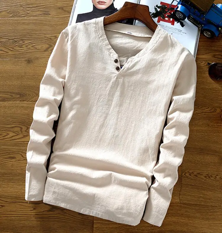 Мужская футболка в китайском стиле, большие размеры, приблизительно 7XL, Новинка лета-осени 2022, топы из хлопка и льна с круглым вырезом и длинным рукавом, однотонный топ с двумя пуговицами