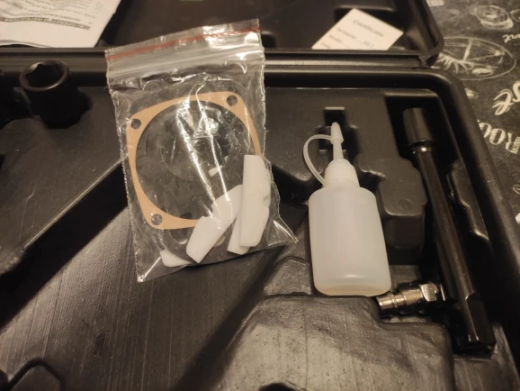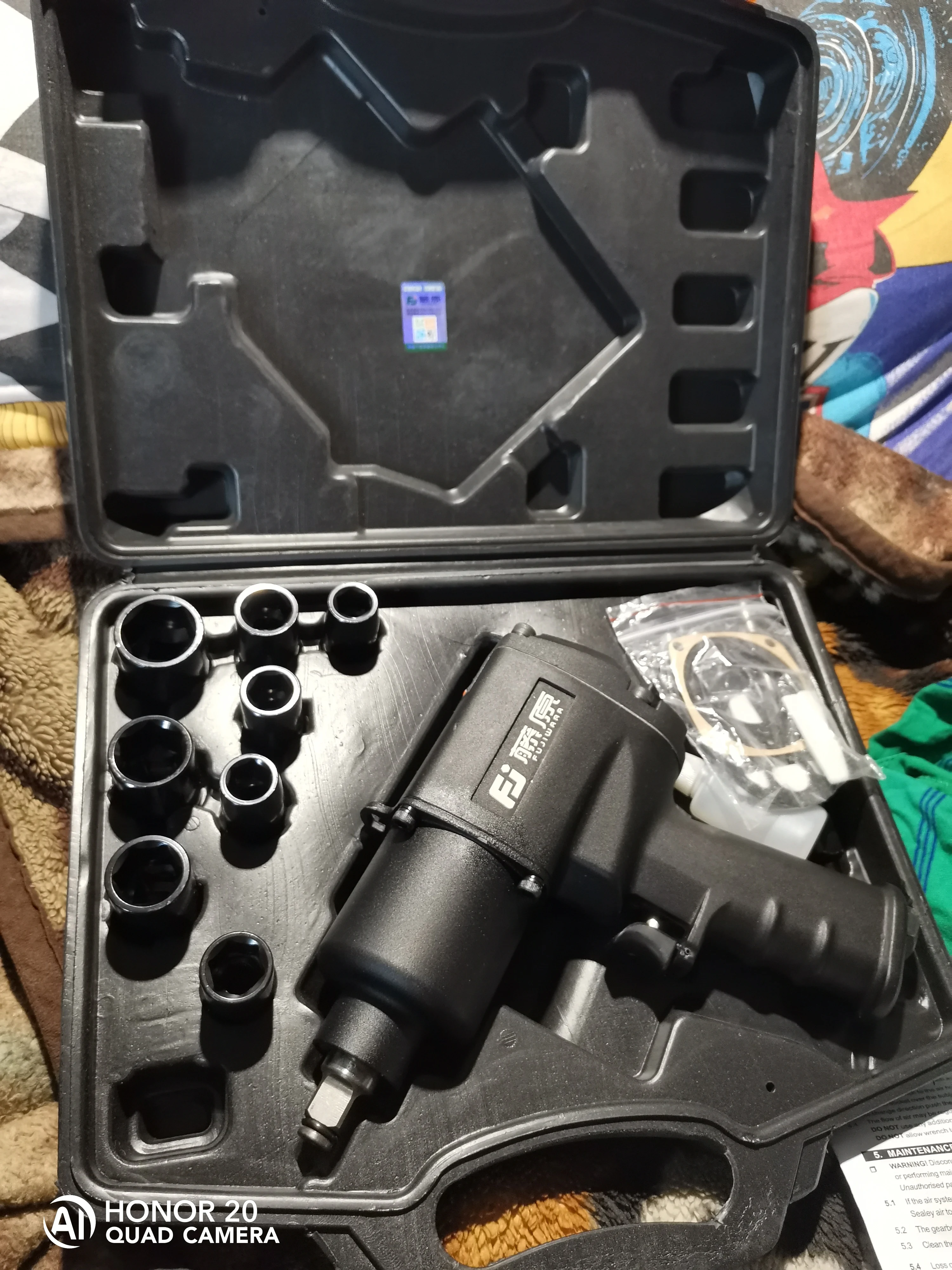 Доставка курьером до квартиры. С виду чёткий. Со смазкой в Китае видимо не очень...) Ящик целый. Ремкомплект. Переходник на быстросъём. Удлинитель. Головки 24, 21, 19, 17, 16, 15, 14. Три из которых вообще не селу. Да и вряд-ли такие поработают, лучше сразу купить ударные. Испытаю и дополню отзыв.
