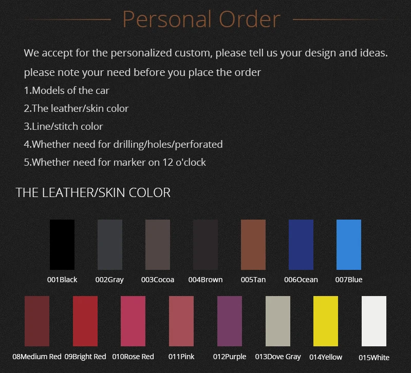 2. Мы принимаемИндивидуальный заказ, Пожалуйста, сообщите нам свой дизайн и идеи. Пожалуйста, обратите внимание на ваши конкретные модели автомобилей перед размещением заказа, а также обратите внимание на цвет кожи/кожи, цвет линии/стежка, нужно ли сверлить/отверстия/перфорированные, нужен ли маркер на 12 часов.