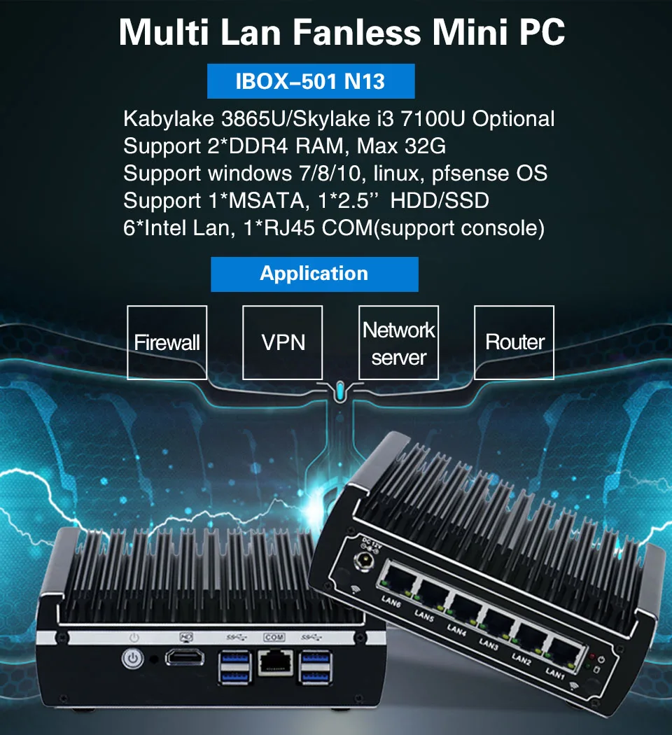 Yanling Pfsense безвентиляторный мини-ПК x86 core i3 7100u celeron 3865u 6 * Intel Lans DDR4 linux брандмауэр маршрутизатор DHCP vpn-сетевой сервер