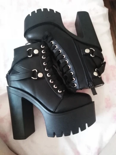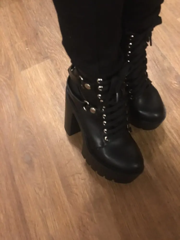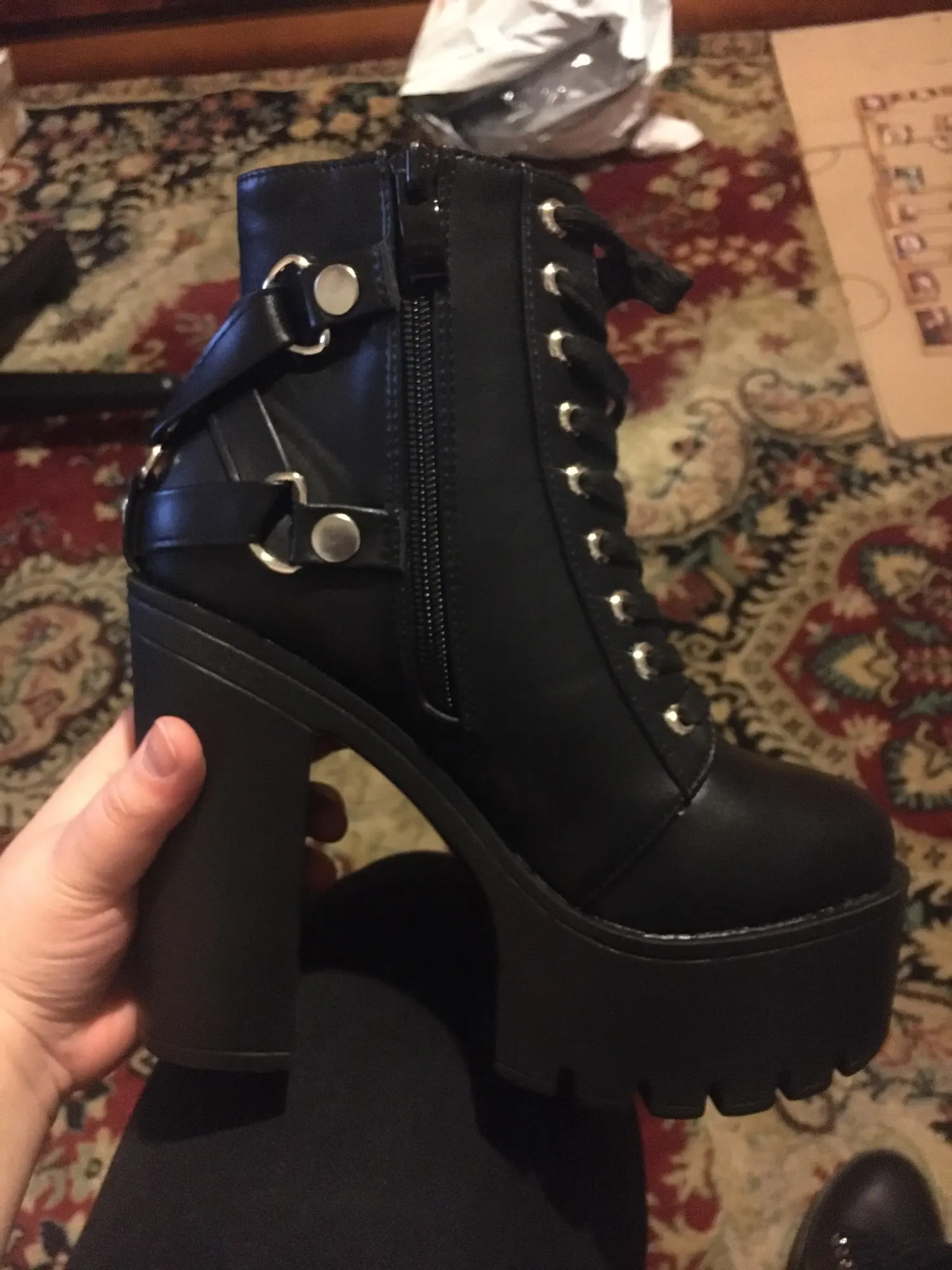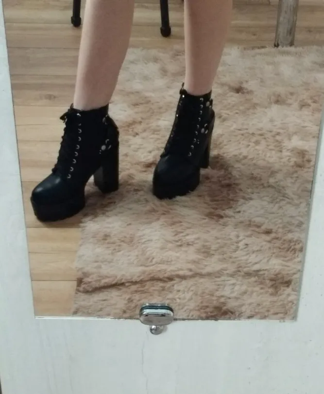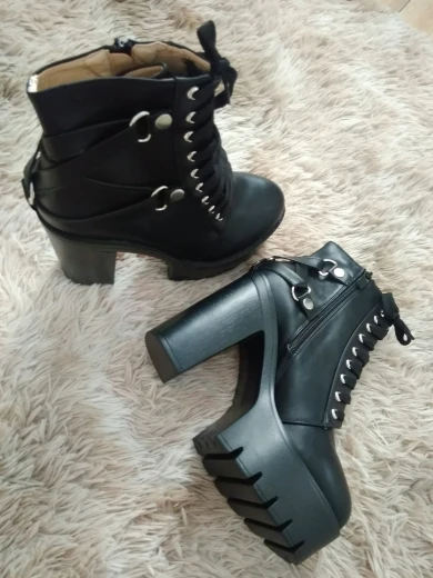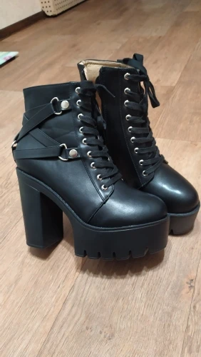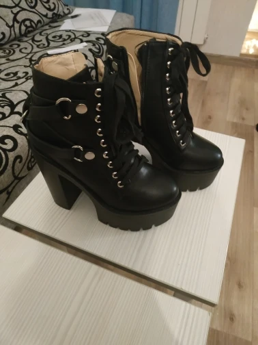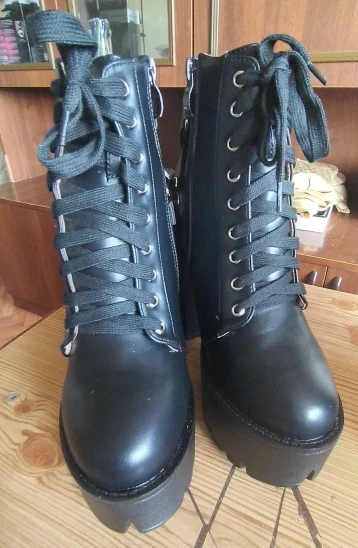 пришли очень быстро. Заказывала 8 размер на тонкую стопу 24,5см - на ботинках указан 39 размер. Но по размеру подошли, и регулируются шнуровкой. Сама обувь была упакована очень надёжно, приехала без повреждений. Швы везде аккуратные, клей нигде не торчит, никаких царапин и заломов. Качество потрясающее за такую цену. На ногах смотрятся массивно, но лёгкие. Каблук устойчивый. Высота обуви в основном за счёт платформы. Высота самого каблука не ощущается на изгибе стопы - и ходить вполне удобно.