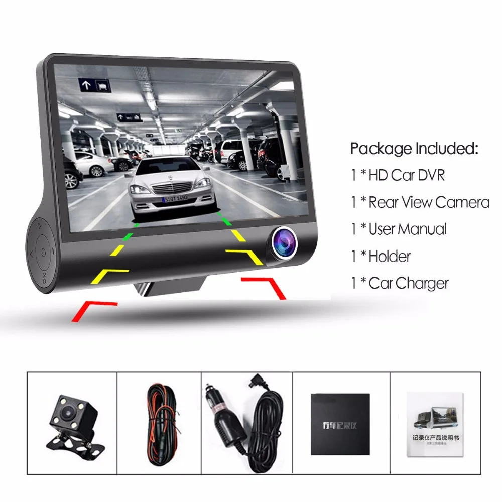 В комплект входит: 1 х Автомобильный видеорегистратор с резервной камерой1 x Зарядное устройство для автомобиля1 x кабель для камеры заднего вида1 x Розничная коробкаРуководство пользователя (1 шт.)Розничная коробка-1 шт.