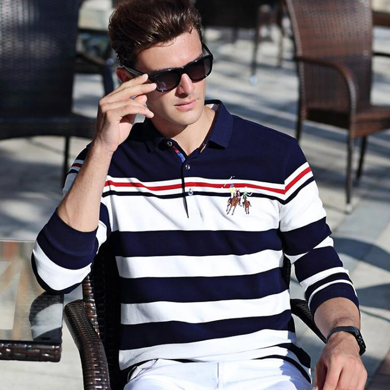 Рубашка-поло мужская в полоску, хлопок, длинный рукав, повседневная...