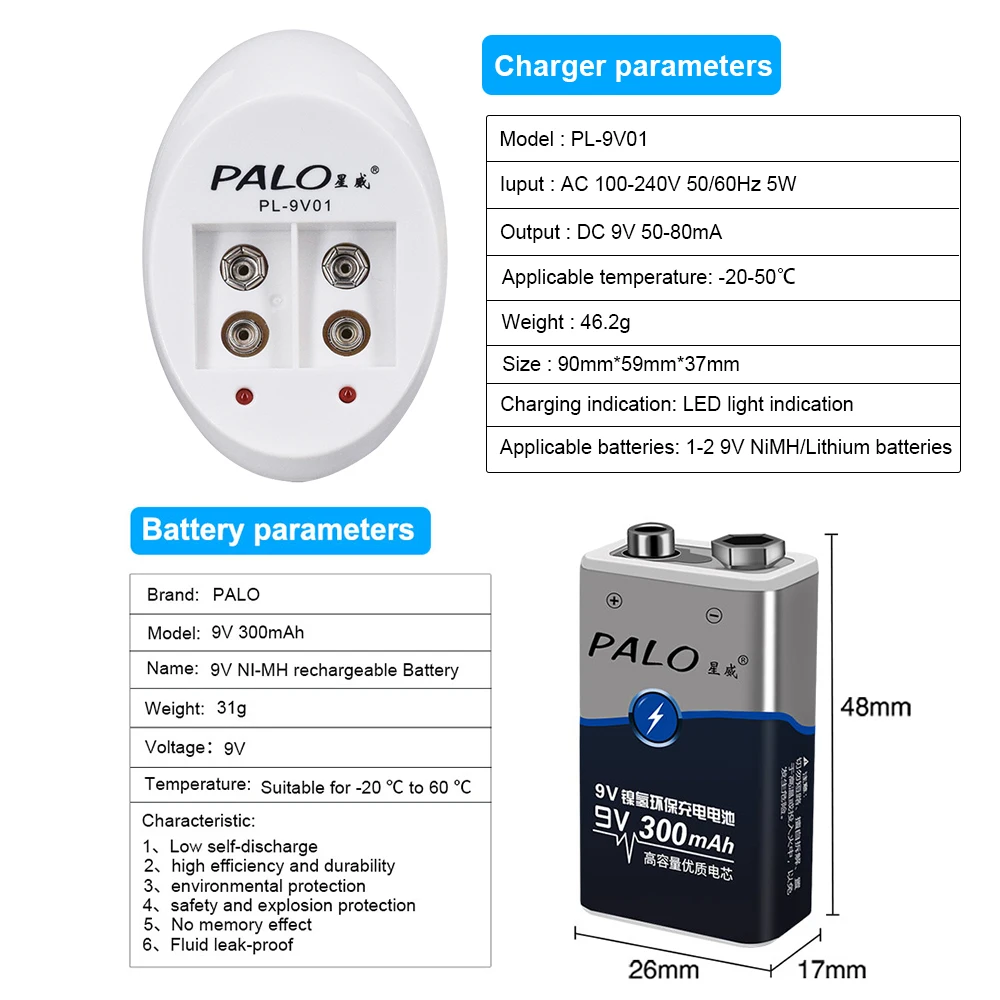 Аккумуляторная батарея PALO 9 в Ni-MH, 9 В 6F22 батареи с умным зарядным устройством для 6F22 9 в NiMh литий-ионная аккумуляторная батарея 9 в