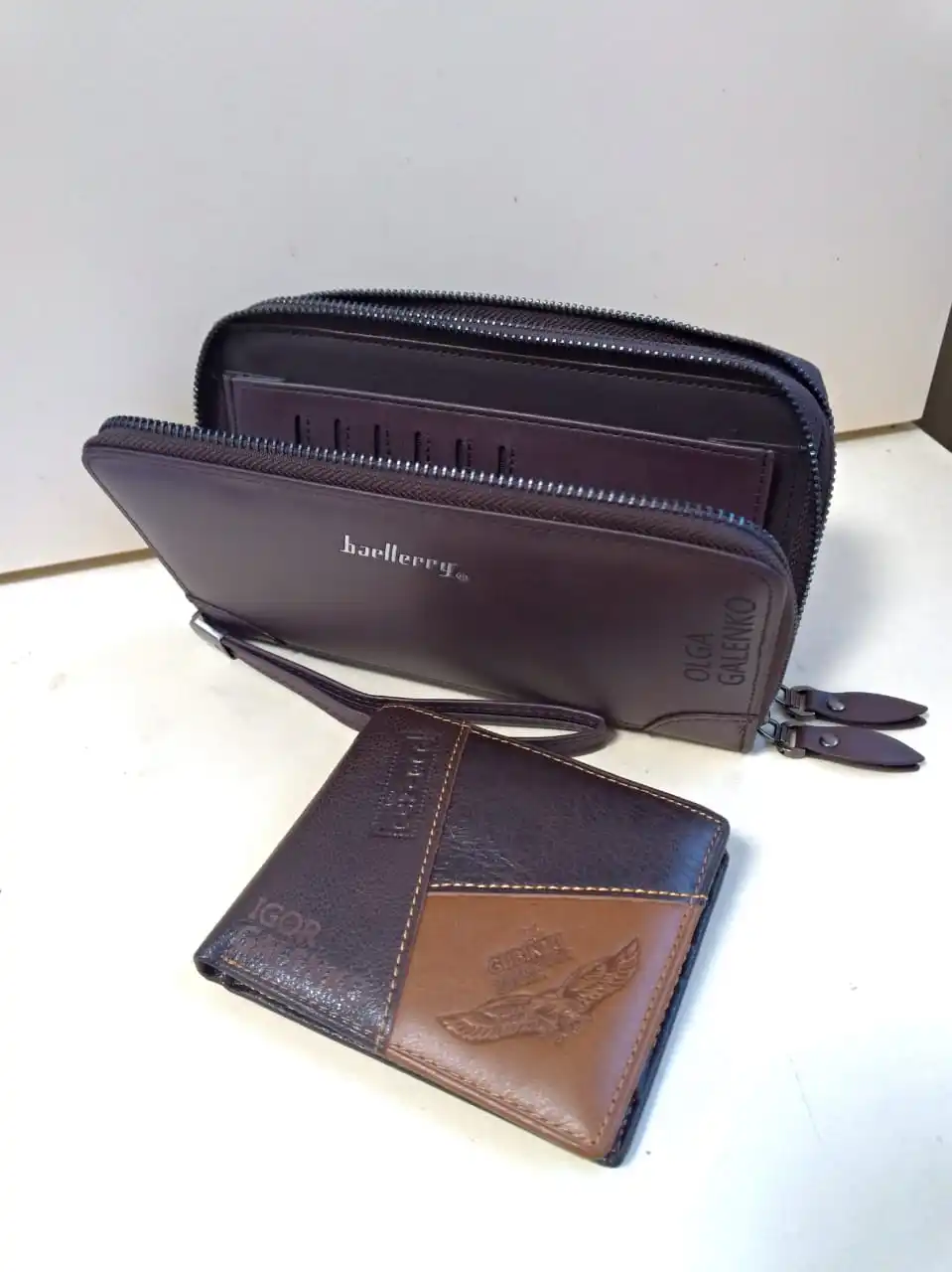 Дошли за три недели в Ростовскую область. Барсетка из дермантина и это сразу видно. Молнии слегка заедают, может разработаются со временем. Вместительная, свободно помещается смартфон, карты, пачка денег. Портмоне порадовало больше- пахнет кожей и на вид солиднее. Гравировка- класс, на портмоне выглядит ярче. Качество пошива, истираемость краев покажет время. Продавцу спасибо. Пять звезд.